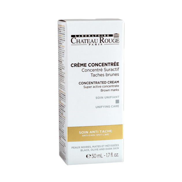CHATEAU ROUGE Paris Concentrated Cream? Dark Spots Treatment?is rich in marine and plant-based?brightening,?anti-dark spot active ingredients, corrects and visibly reduces pigmentation marks.?targets specific areas of hyperpigmentation while?remaining gentle?on black, olive and mixed-race skin. It has been conceived for the health, the beauty and the pleasure of black, olive and dark skins.