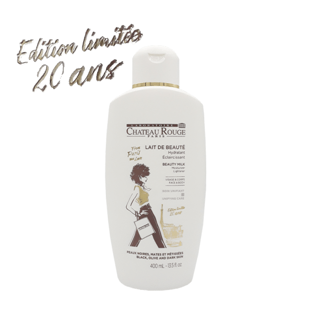 CHATEAU ROUGE Paris? Moisturizer & Brightener Beauty Milk – 400 ml gives your skin a soft, satin-like, uniformly clear appearance. Its lightening active ingredients, primarily of plant origin, favour the reduction of dark spots.?The lightening beauty milk unifies zones darker as joints ?(articulations), fingers, elbows and knees. Its plant and marine?brightening?active?ingredients help to reduce pigmentation marks and even out the skin.
