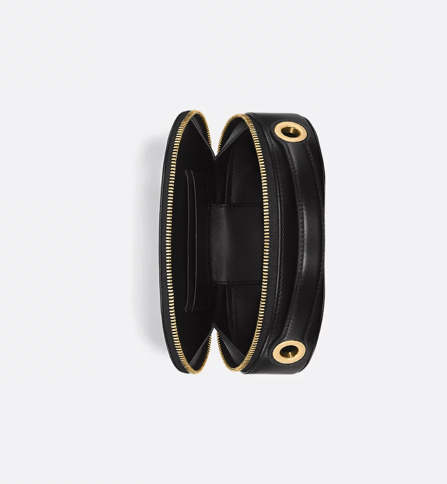 New for Fall 2023, Maria Grazia Chiuri has created the CD Signature oval Camera bag to combine functional design with the House’s modern spirit. Crafted in black calfskin, it is distinguished by an embossed CD signature on the front, demonstrating Dior’s savoir-faire. Featuring a spacious compartment, it is completed by two interior card slots and a two-way zip closure. Its leather top handle and adjustable, removable chain strap allow it to be carried by hand, worn over the shoulder or crossbody as an ideal daily companion.