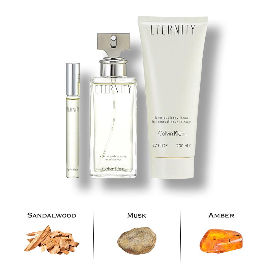 One of the most successful Calvin Klein fragrances.?Eternity was born in tribute to their marriage.?A hymn to the eternity of the most important values: love, family and peace.?The composition opens with fresh notes of citrus and plants, followed by violet and lily of the valley.?The carnation note gives the floral heart a slightly spicy touch.?The base notes are soft, with heliotrope, pink sandalwood and transparent notes of musk.?The perfume was created by Sophia Grojsman in 1988.?