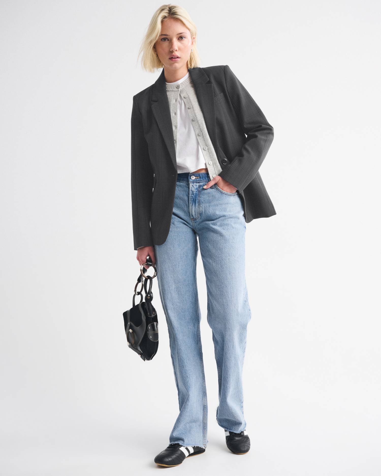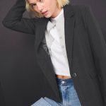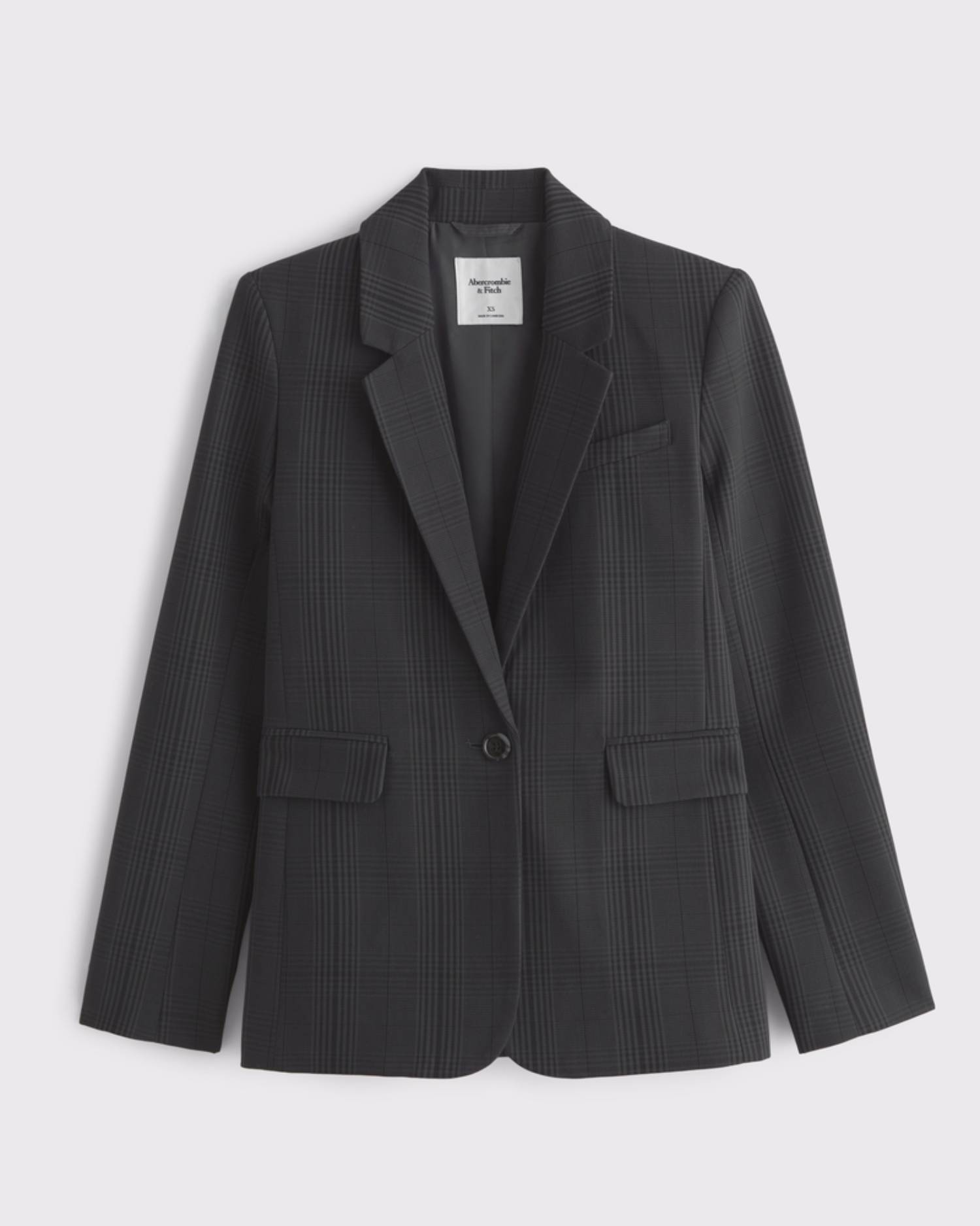 On-trend single-breasted blazer in our menswear suiting fabric. Features an interior pocket, sleeve buttons, side pockets and center-button closure. This blazer features a straight-cut silhouette, size down for a slimmer fit. Imported.