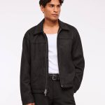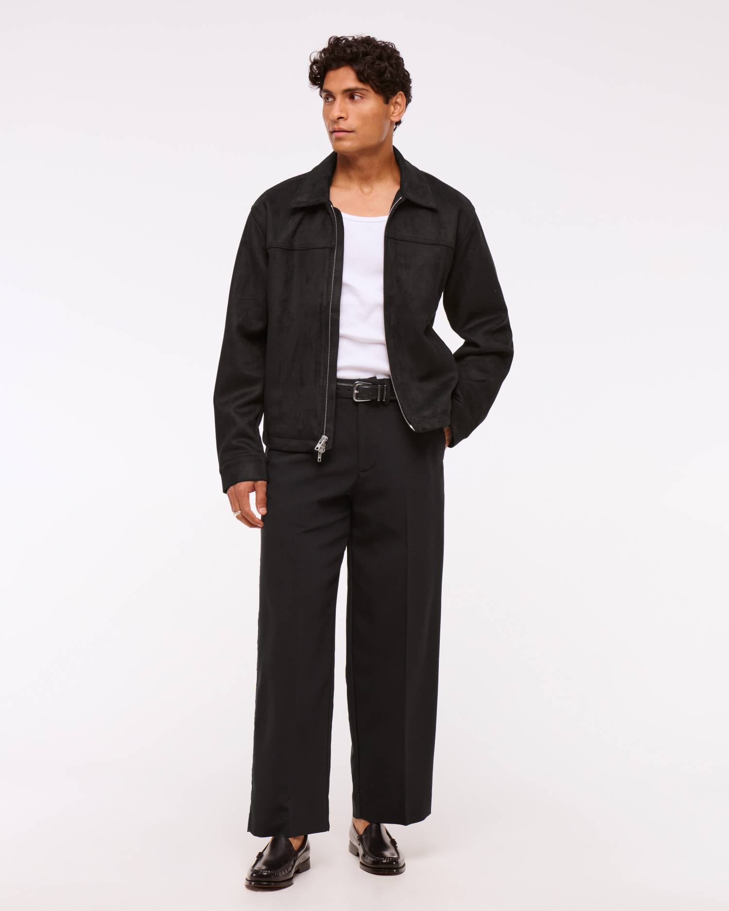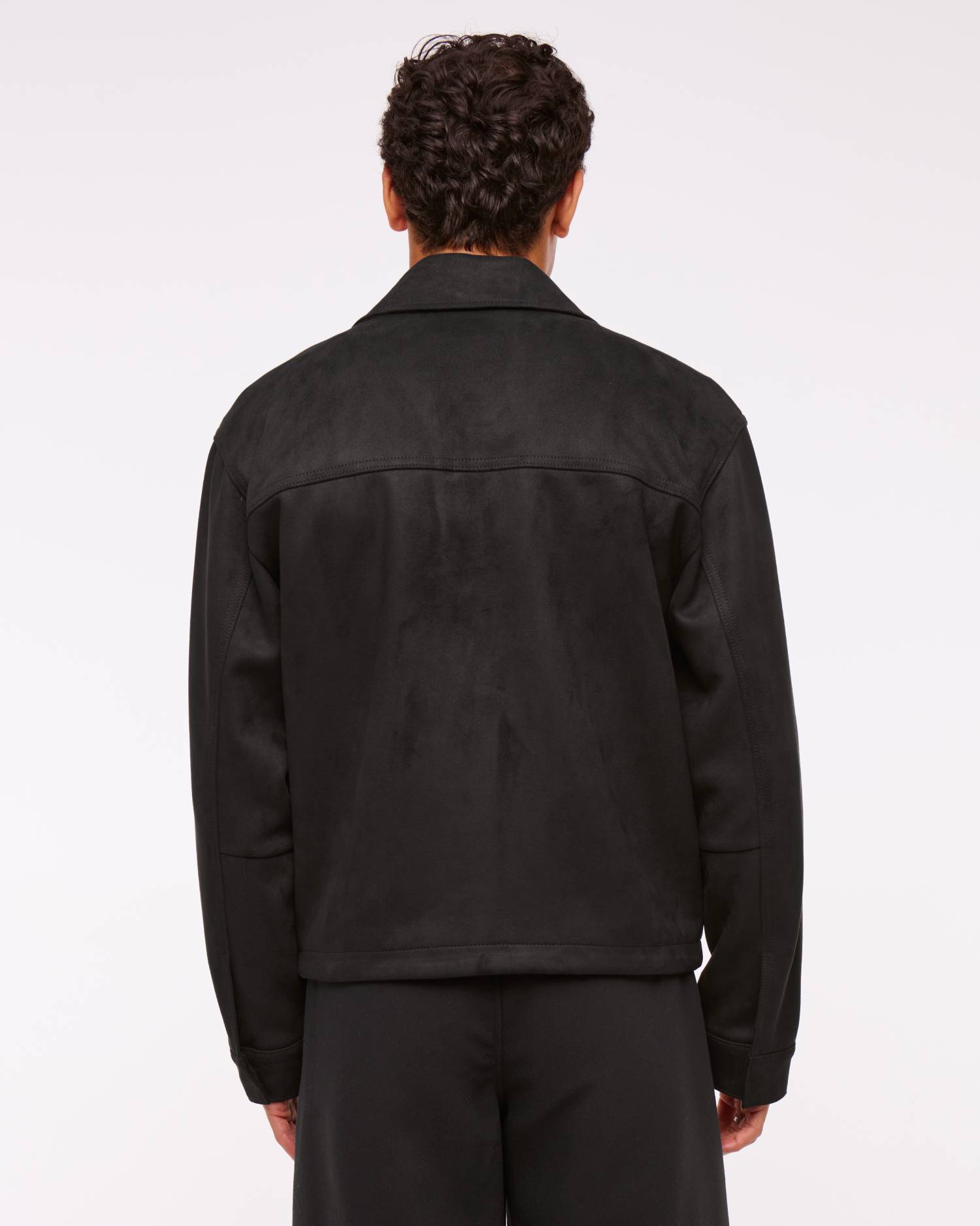 Our new lightweight trucker-style jacket in a soft vegan suede fabric, featuring a relaxed-fit silhouette, side pockets with interior chest pocket, mockneck collar, zip-up front and lightweight interior lining.?? Imported.