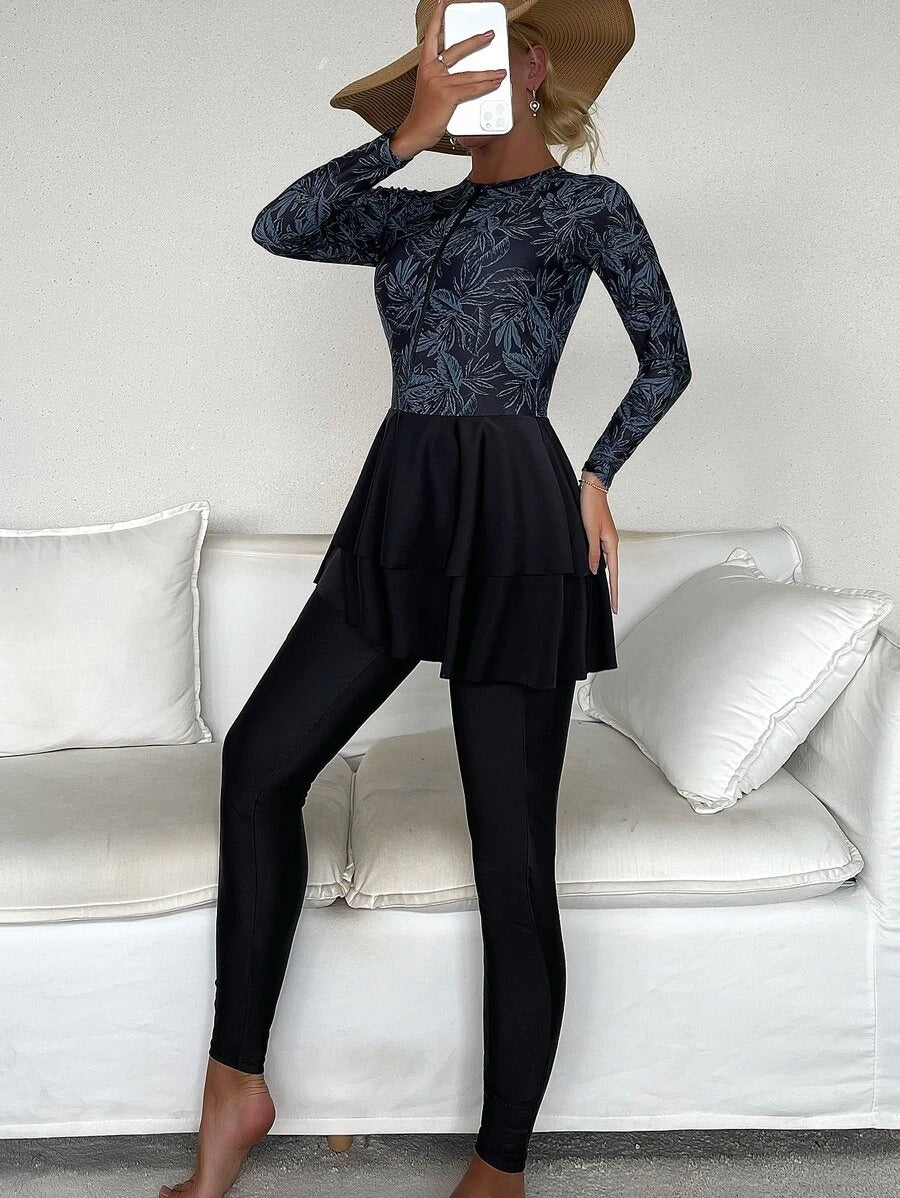 Floral Print Tankini Set Long Sleeve Zip Front Full Body Longline Swim Shirt & Leggings 2 Piece Swimsuit