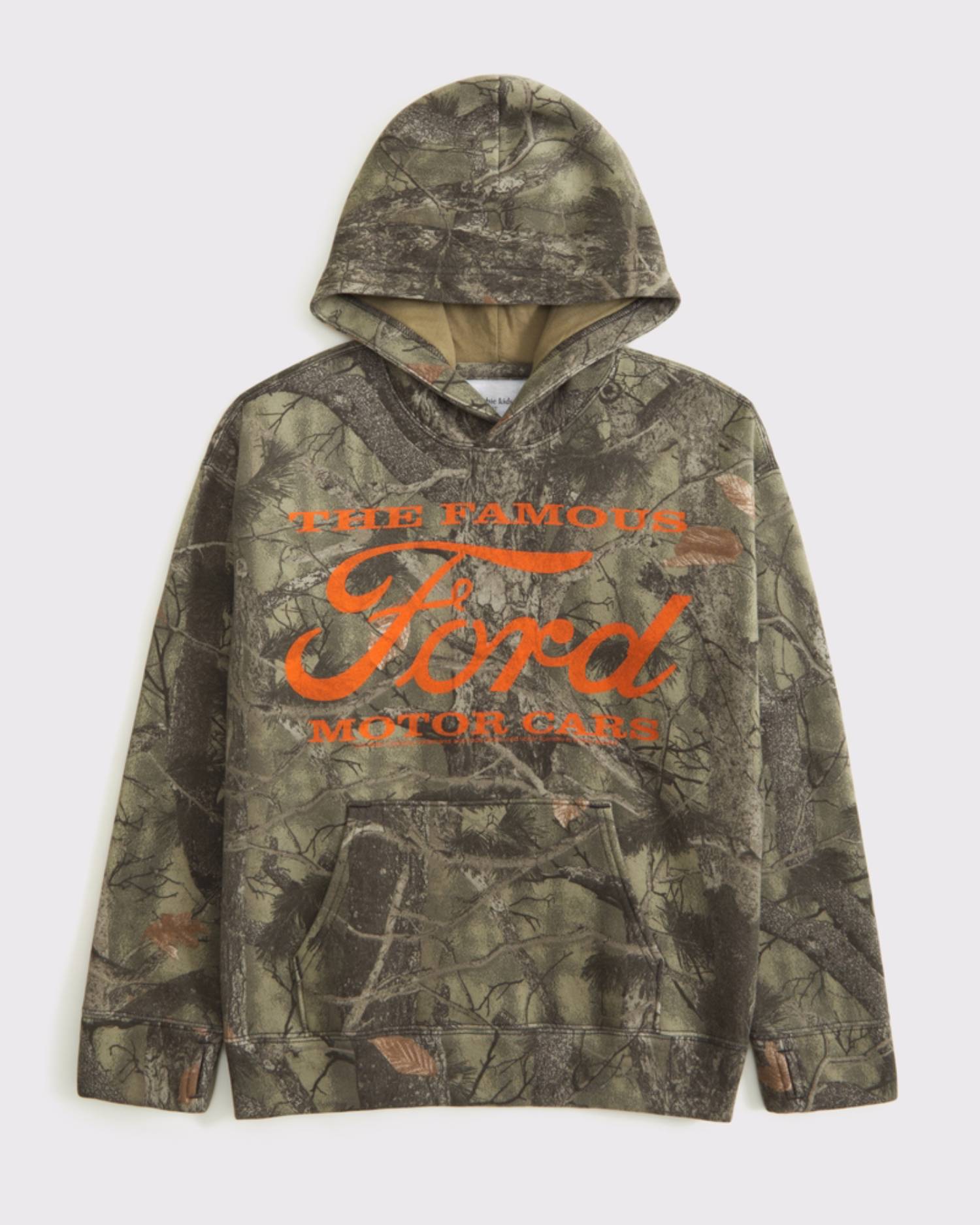 Comfy popover hoodie in our soft fleece fabric, featuring Ford-inspired graphic detail at chest, front pouch pocket, ribbed hem and thumbholes at cuffs. Imported.
