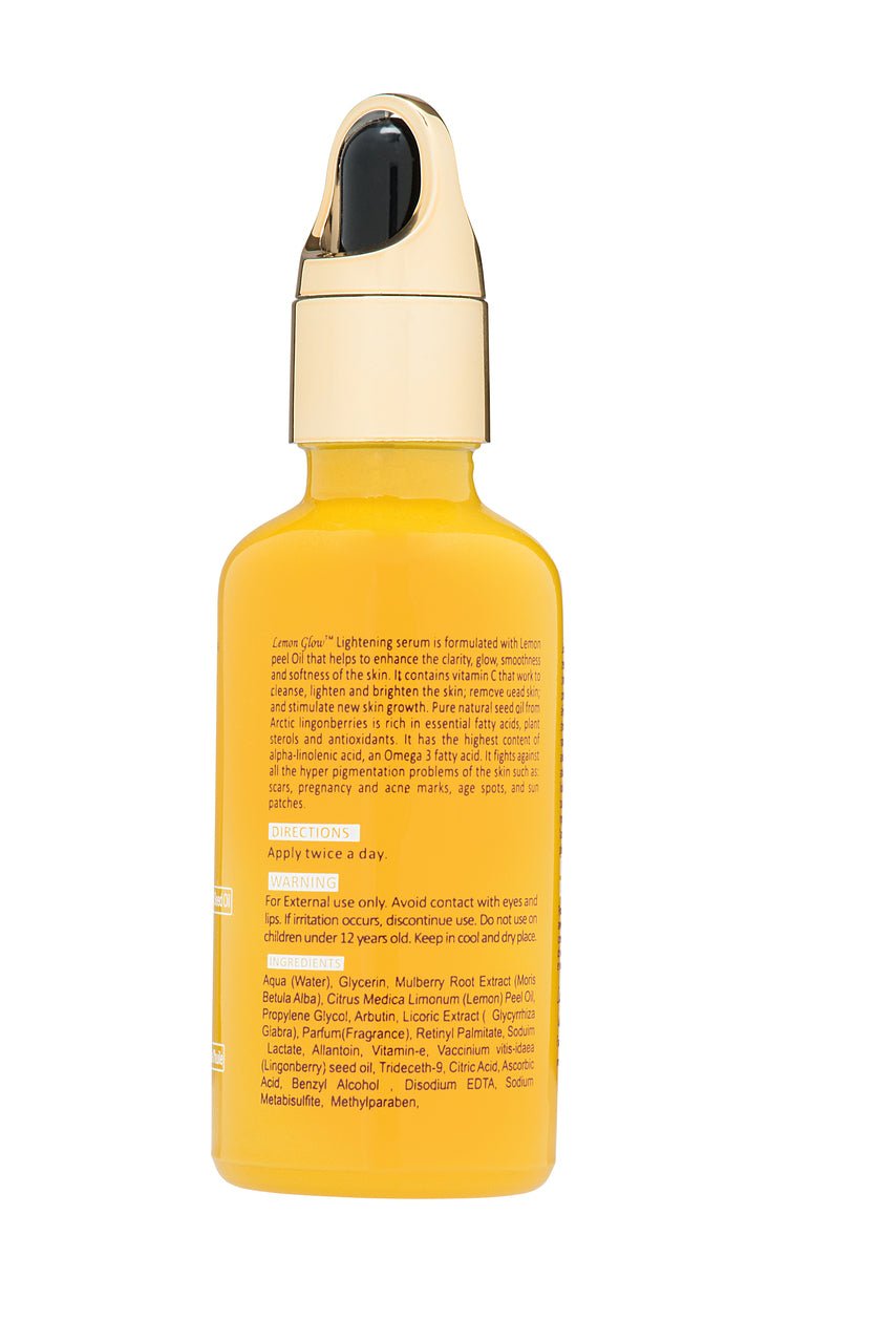 Lemon Glow Lightening Serum is formulated with Lemon peel Oil that helps enhance the clarity, glow and smoothness of the skin, its vitamin C works to cleanse, lighten and brighten the skin, remove dead skin and stimulate skin growth.?The serum can be used on the face and body as a powerful spot treatment or all over the face before applying moisturizer. The serum removes dark spots and leaves the skin looking more even. This is an ideal treatment for acne-prone.