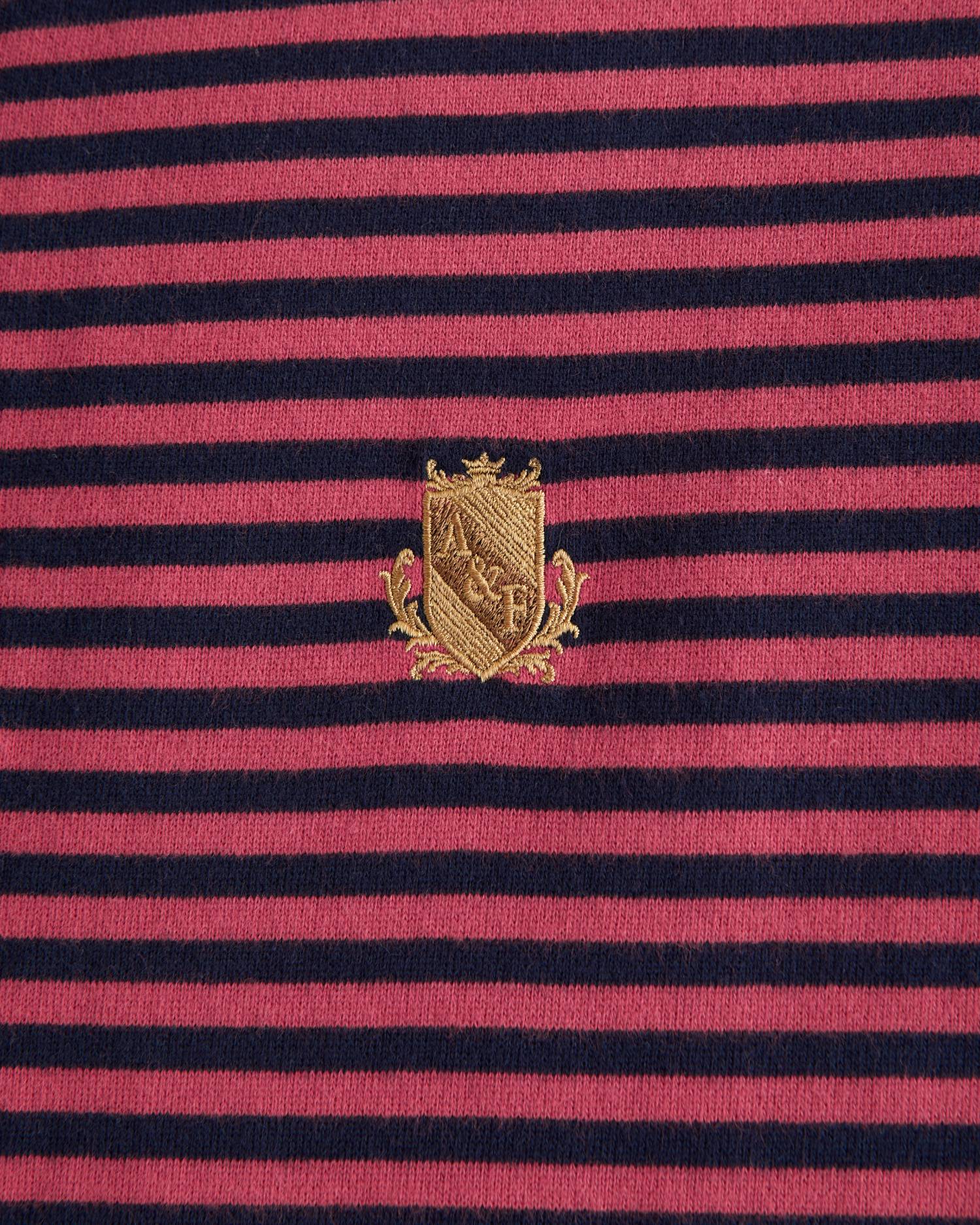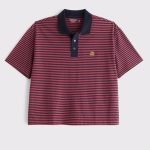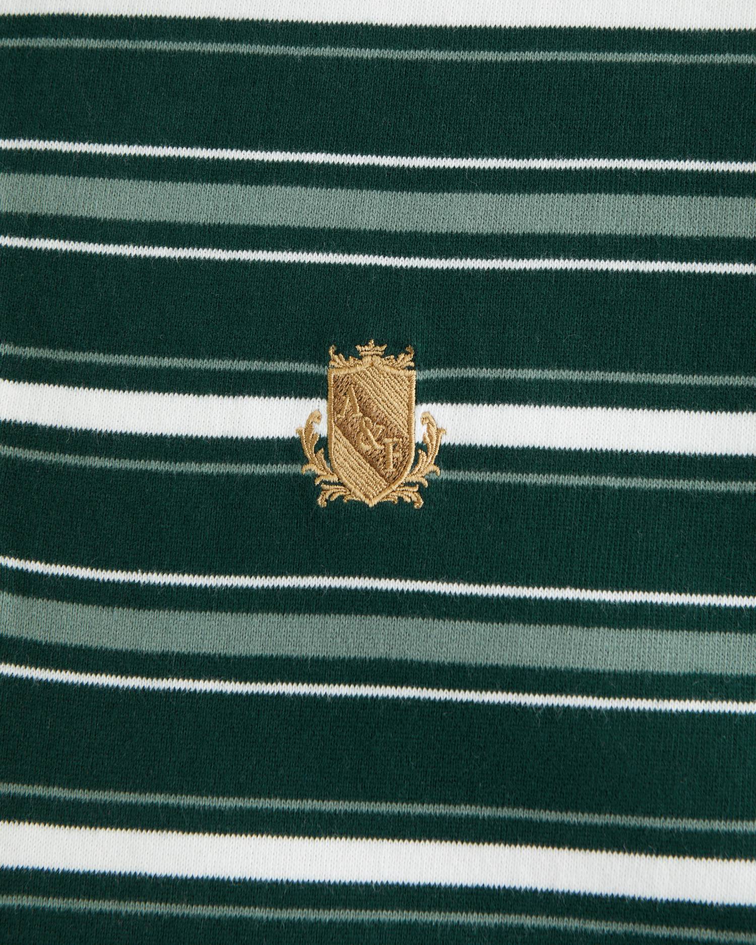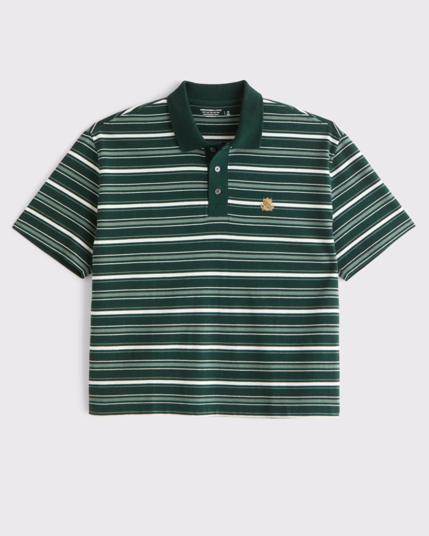 Our new short-sleeve tennis-inspired polo in our heavyweight cotton fabric and oversized, cropped fit, featuring a striped pattern, embroidered crest logo detail at left chest, classic collar and three-button placket. Imported.