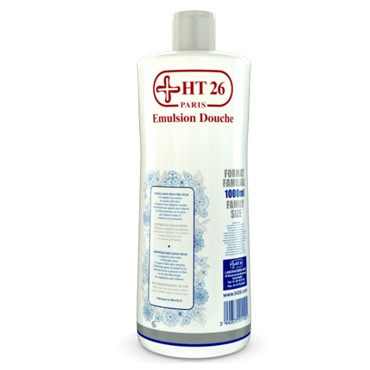 HT26 CLEANSING SHOWER EMULSION is intended for sensitive skin types. The synergy of four active substances, selected for their complementary properties, has resulted in an ultra-gentle formulation: – LACTOSERUM regulates skin pH – GLYCERINE for its emollient properties – a FILM-FORMING AGENT reduces skin dehydration – ULTRA-GENTLE SURFACTANTS forming a creamy,delicate lather.