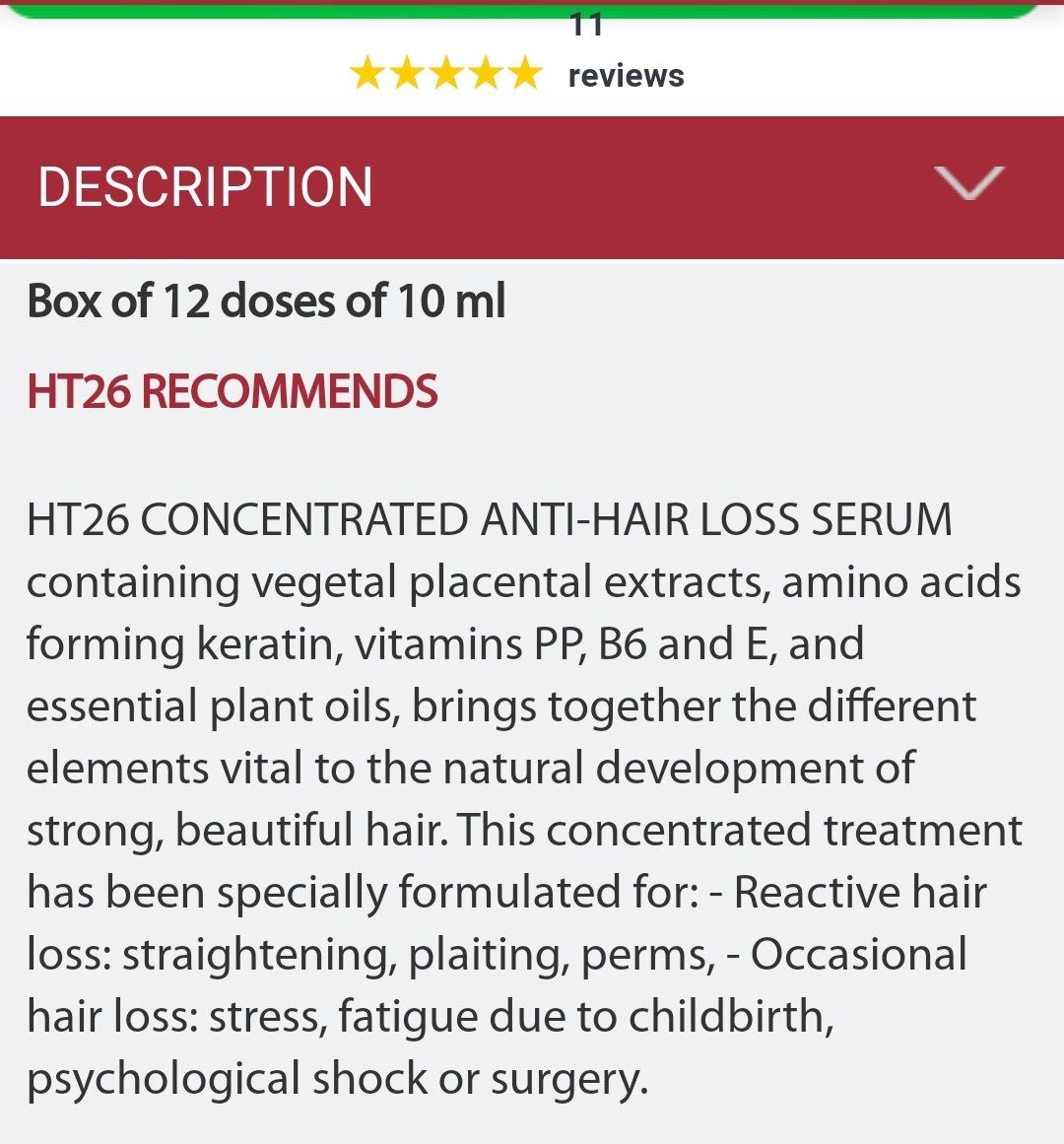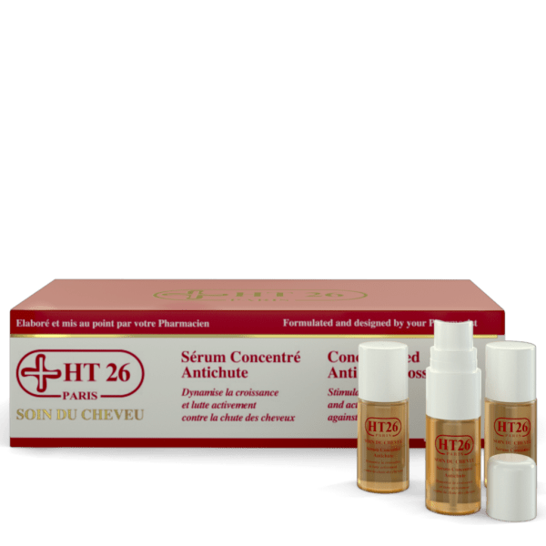HT26 CONCENTRATED ANTI-HAIR LOSS SERUM containing vegetal placental extracts, amino acids forming keratin, vitamins PP, B6 and E, and essential plant oils, brings together the different elements vital to the natural development of strong, beautiful hair. This concentrated treatment has been specially formulated for: – Reactive hair loss: straightening, plaiting, perms, – Occasional hair loss: stress, fatigue due to childbirth, psychological shock or surgery.