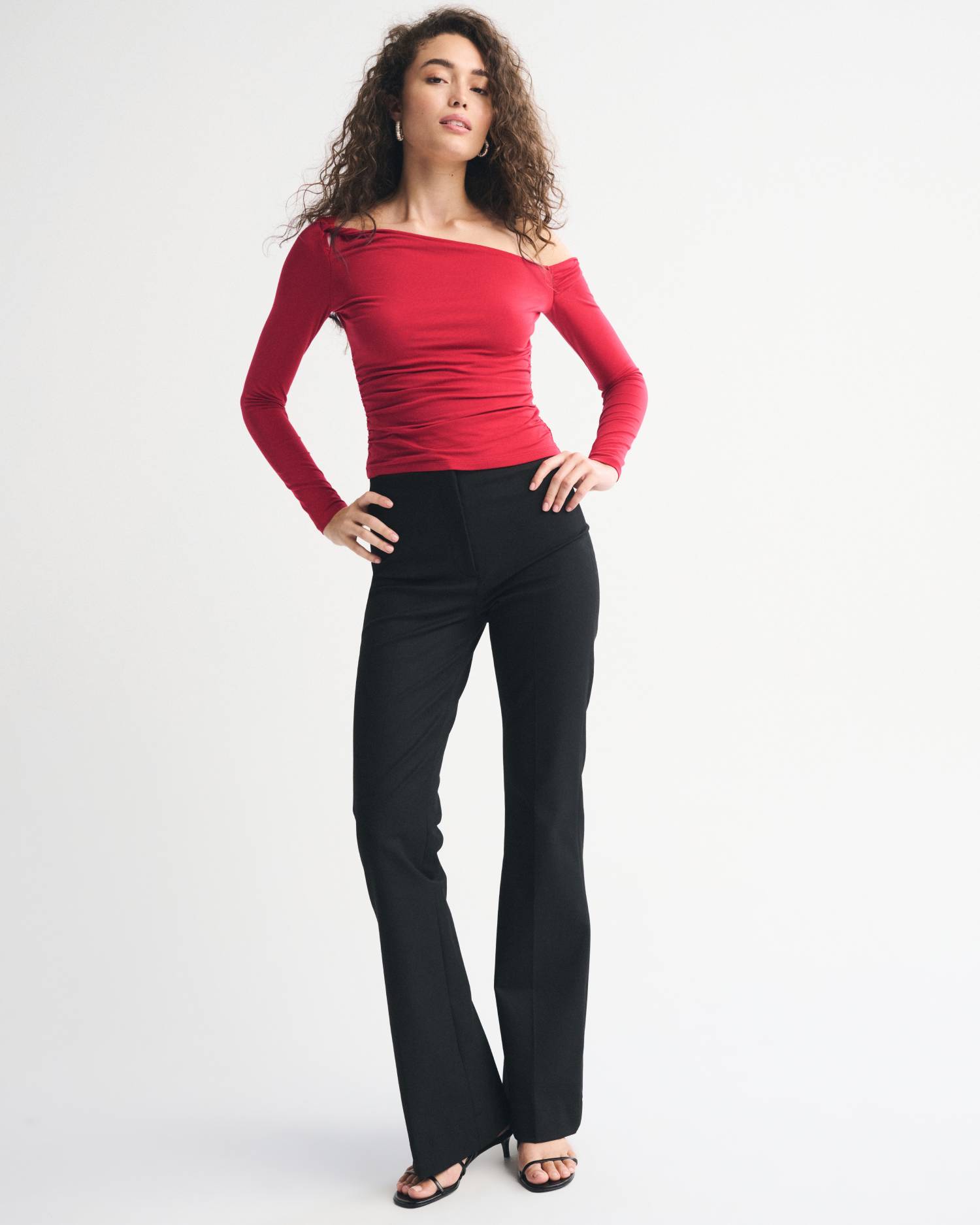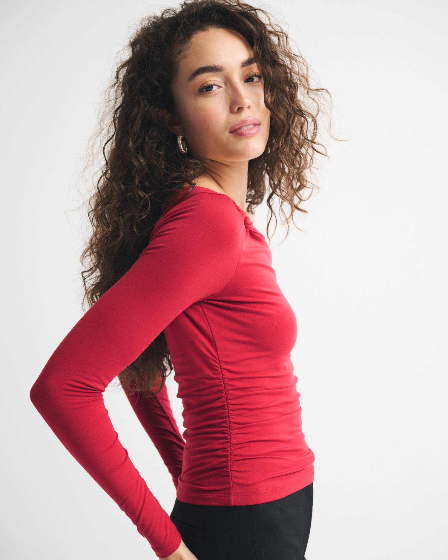Slim-fitting long-sleeve top in our softAF cotton-modal fabric. Features an asymmetrical neckline, ruching details along the bodice and twisted detail on the shoulders. Imported.