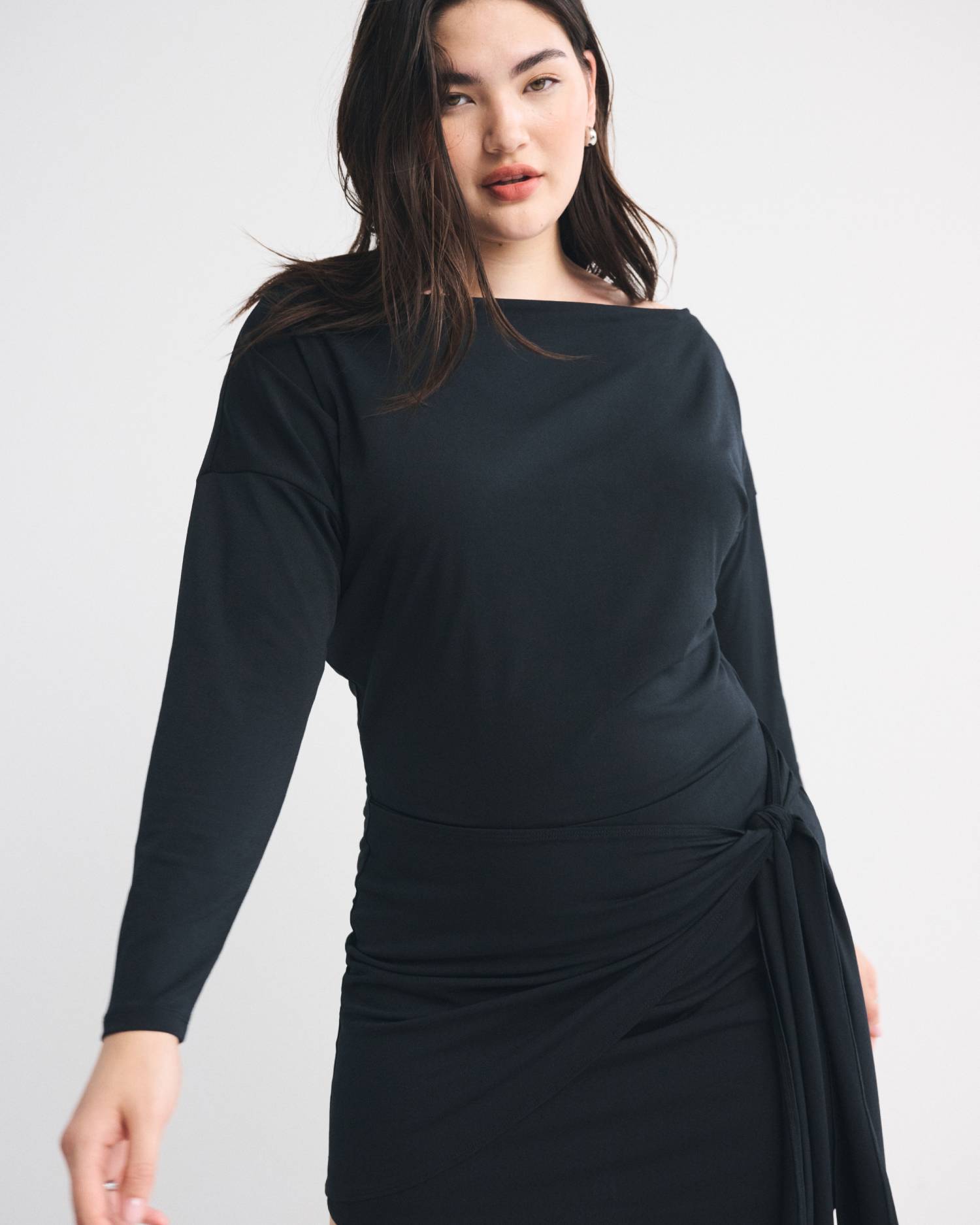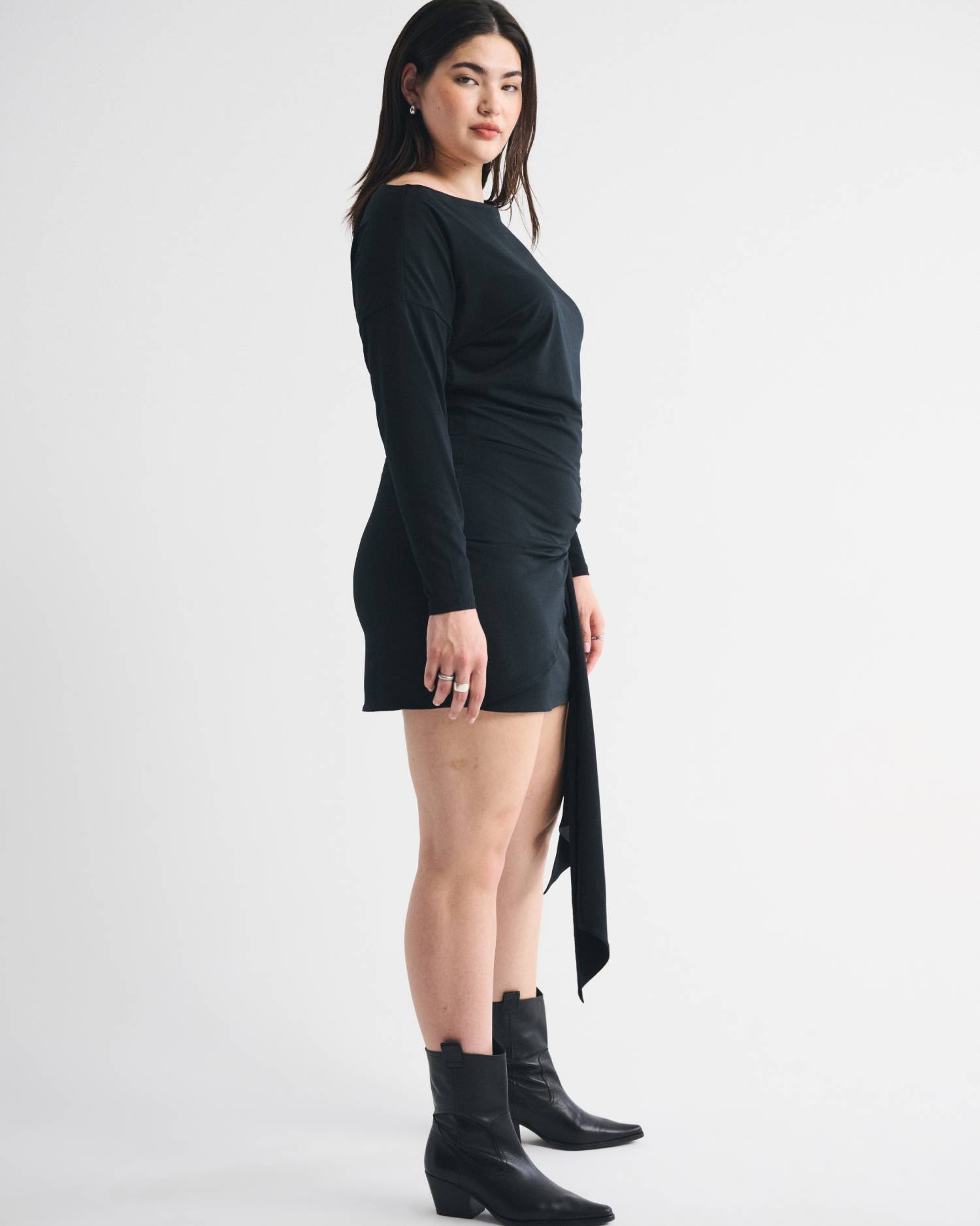 Flattering long-sleeve mini dress in our soft knit fabric. Features an asymmetrical neckline, draped details along the bodice and front wrap-tie detail for the perfect fit.?? Imported.