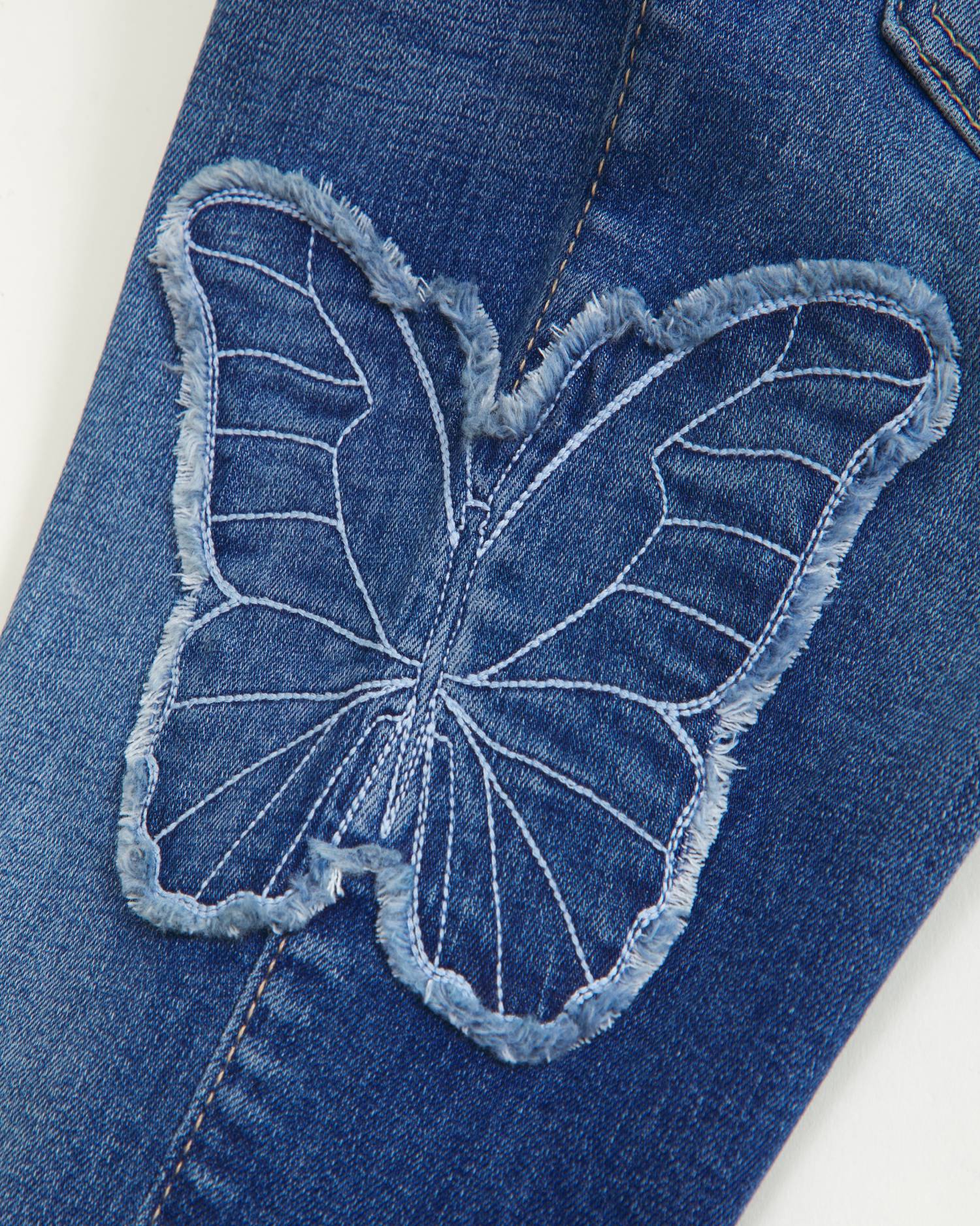 Our new low rise bootcut jeans with Y2K-inspired details, medium wash, embroidered butterfly graphic detail and waistband adjusters in all sizes.?? Imported.