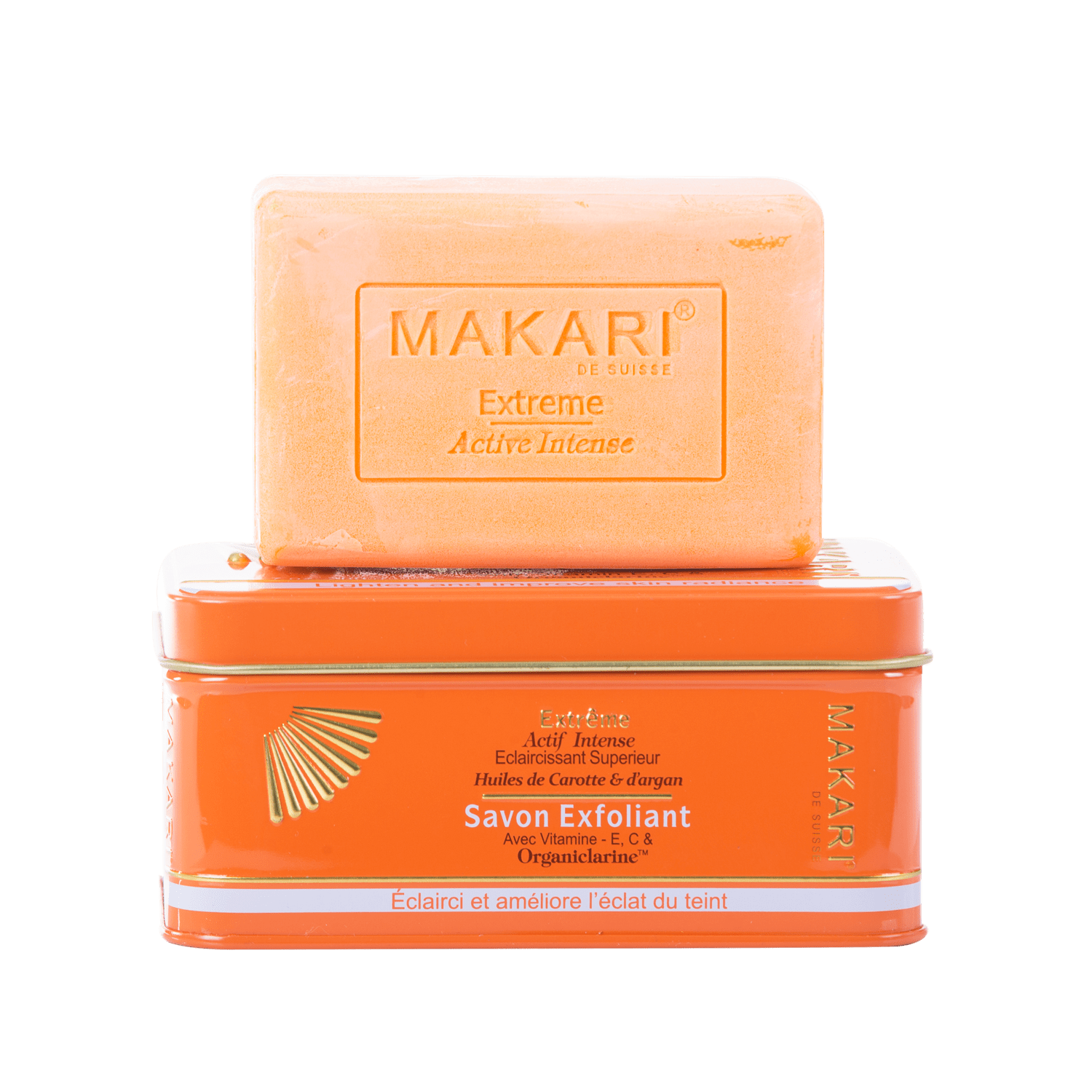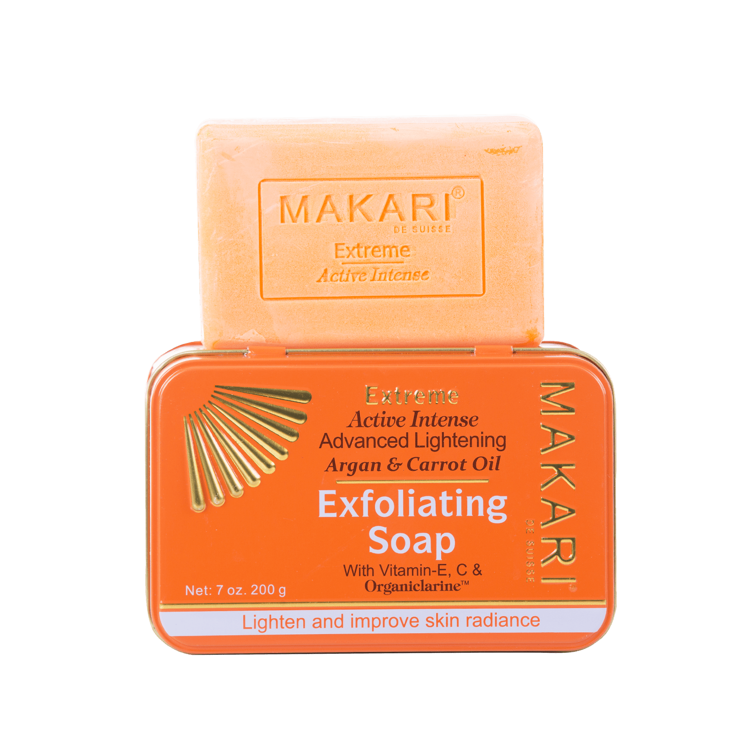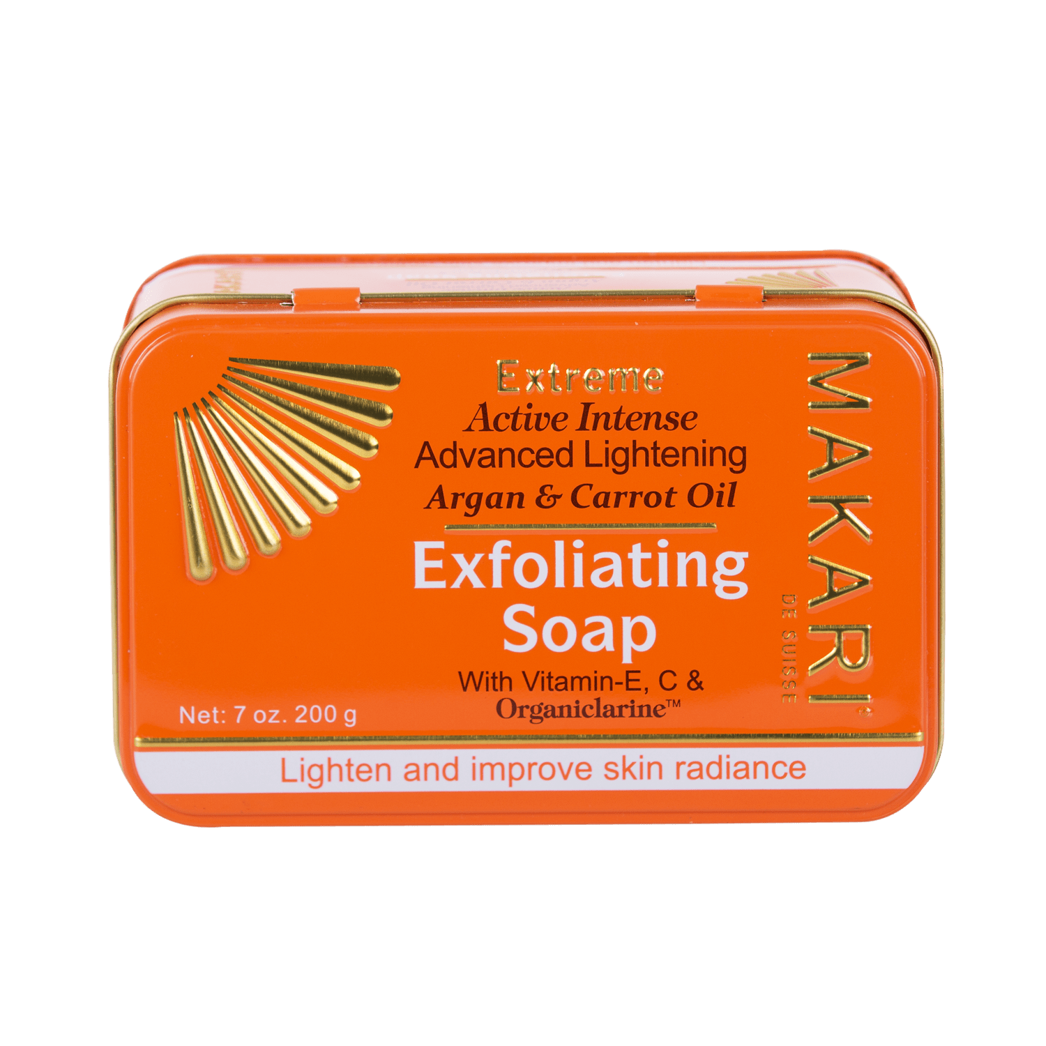 MAKARI – EXTREME ARGAN & CARROT OIL EXFOLIATING SOAP – Exfoliates. Lightens. Unifies tone.? For all skin types except sensitive: Uncover lighter skin with this cleansing, exfoliating soap bar that detoxifies and removes impurities sloughing off dull, dead skin revealing an?illuminated skin tone.