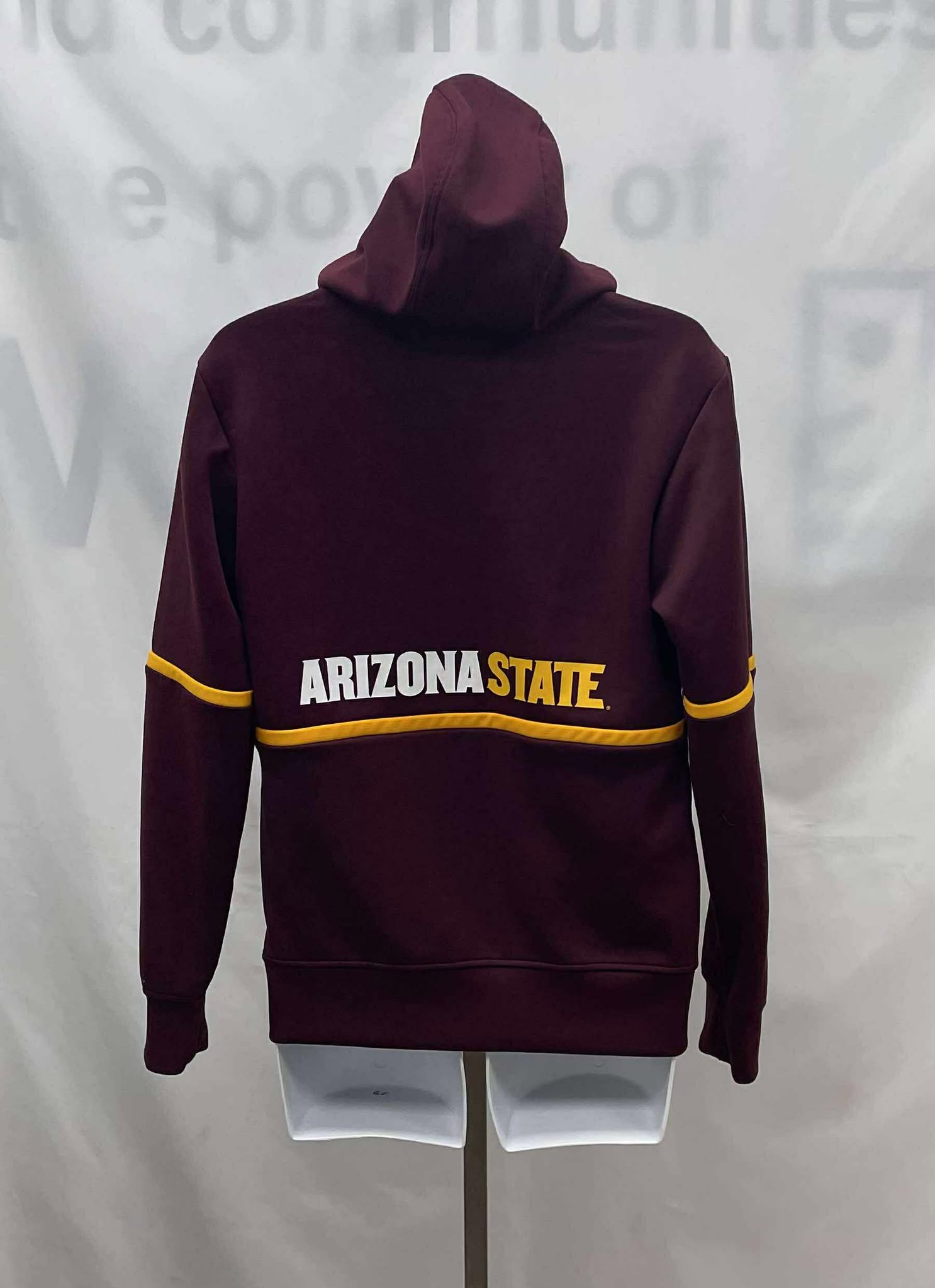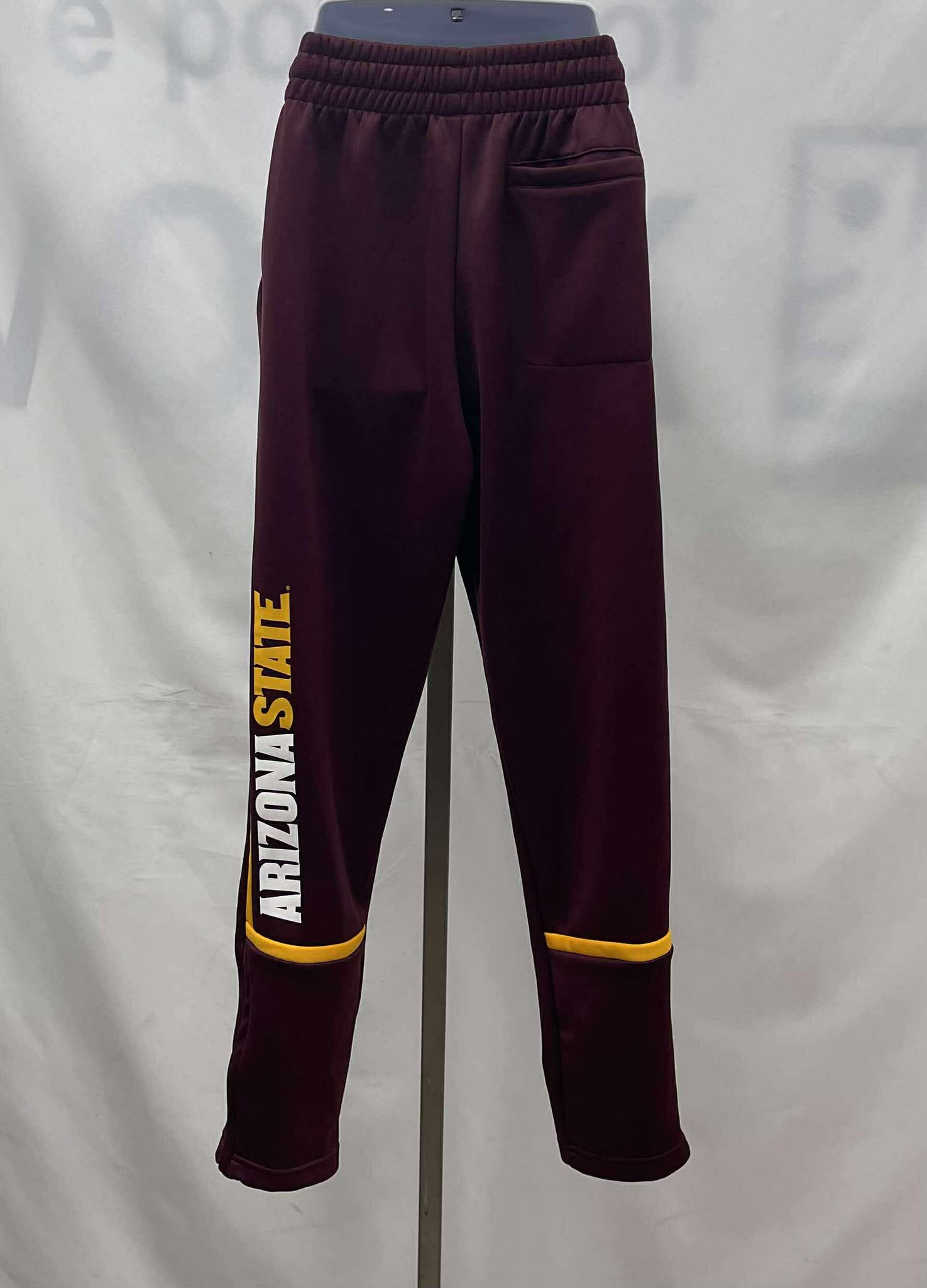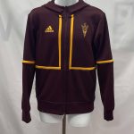 Details: Men’s maroon, with orange banding, two piece, long sleeved, hooded, Adidas track suit.