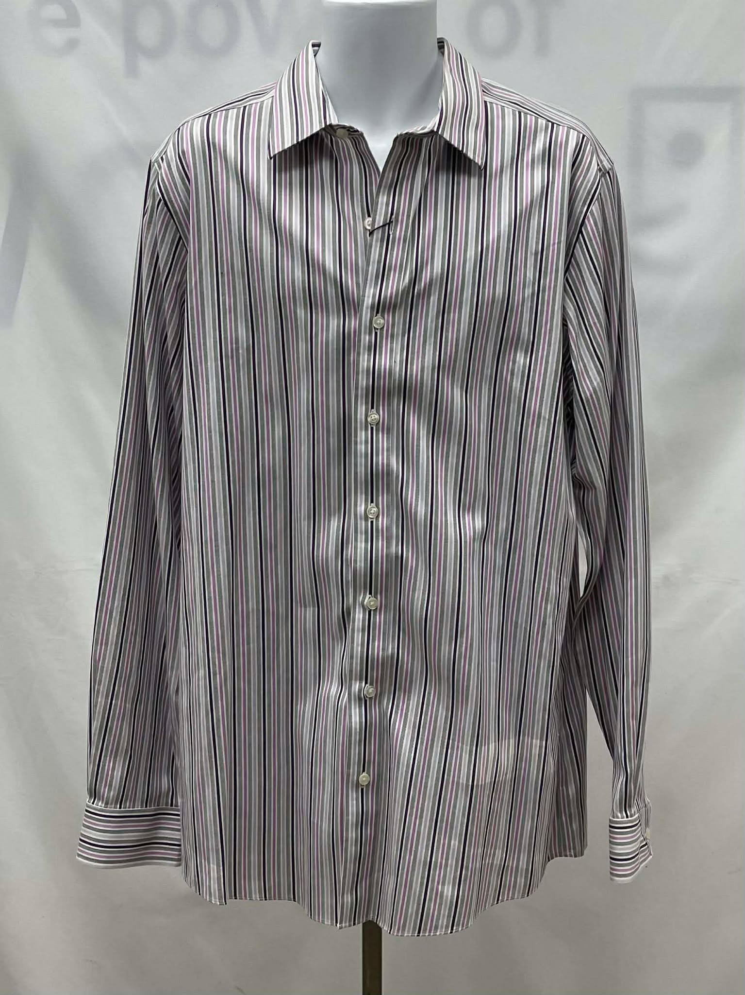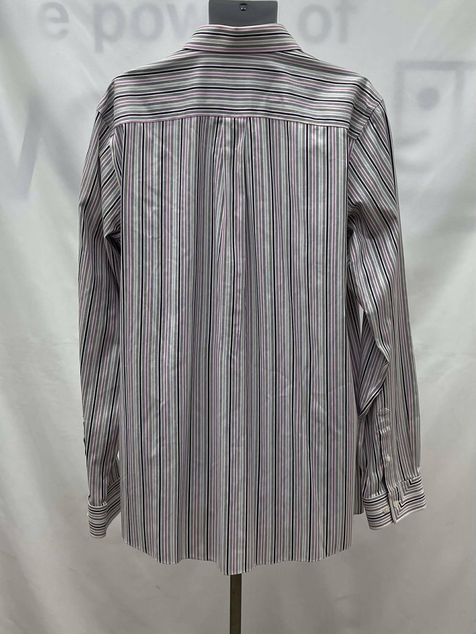 Details: Men’s white, with pink, grey, and purple stripes, collared, long sleeve Denver Hayes shirt. ( With Original Tag )