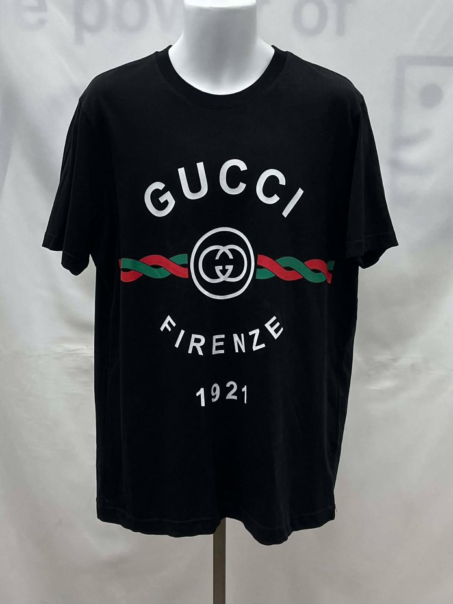 Details: Men’s black with front logo graphic, short sleeve Gucci top. ( As Is / Not Authenticated )