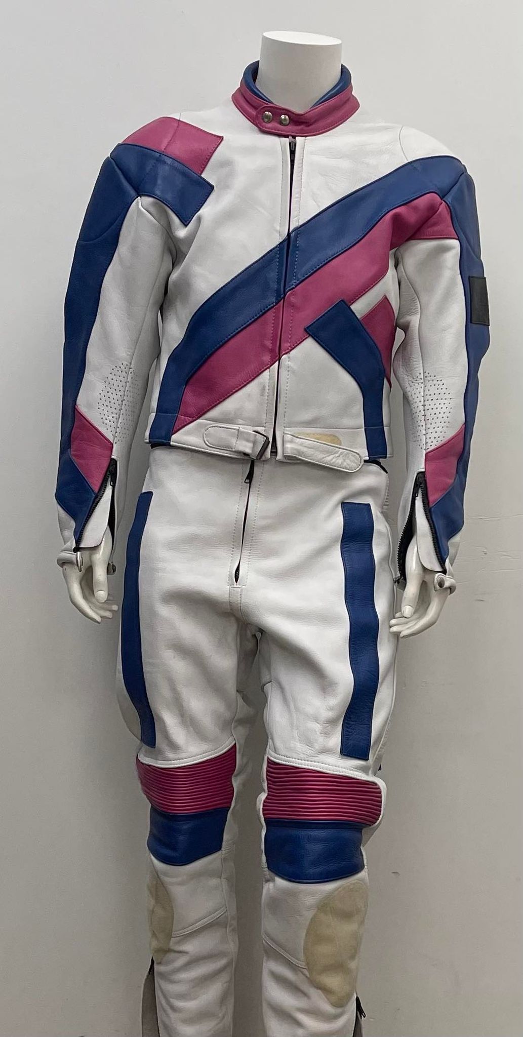 Details: Men’s white, pink, and blue leather, Joe Rocket two piece motorcycle suit.
