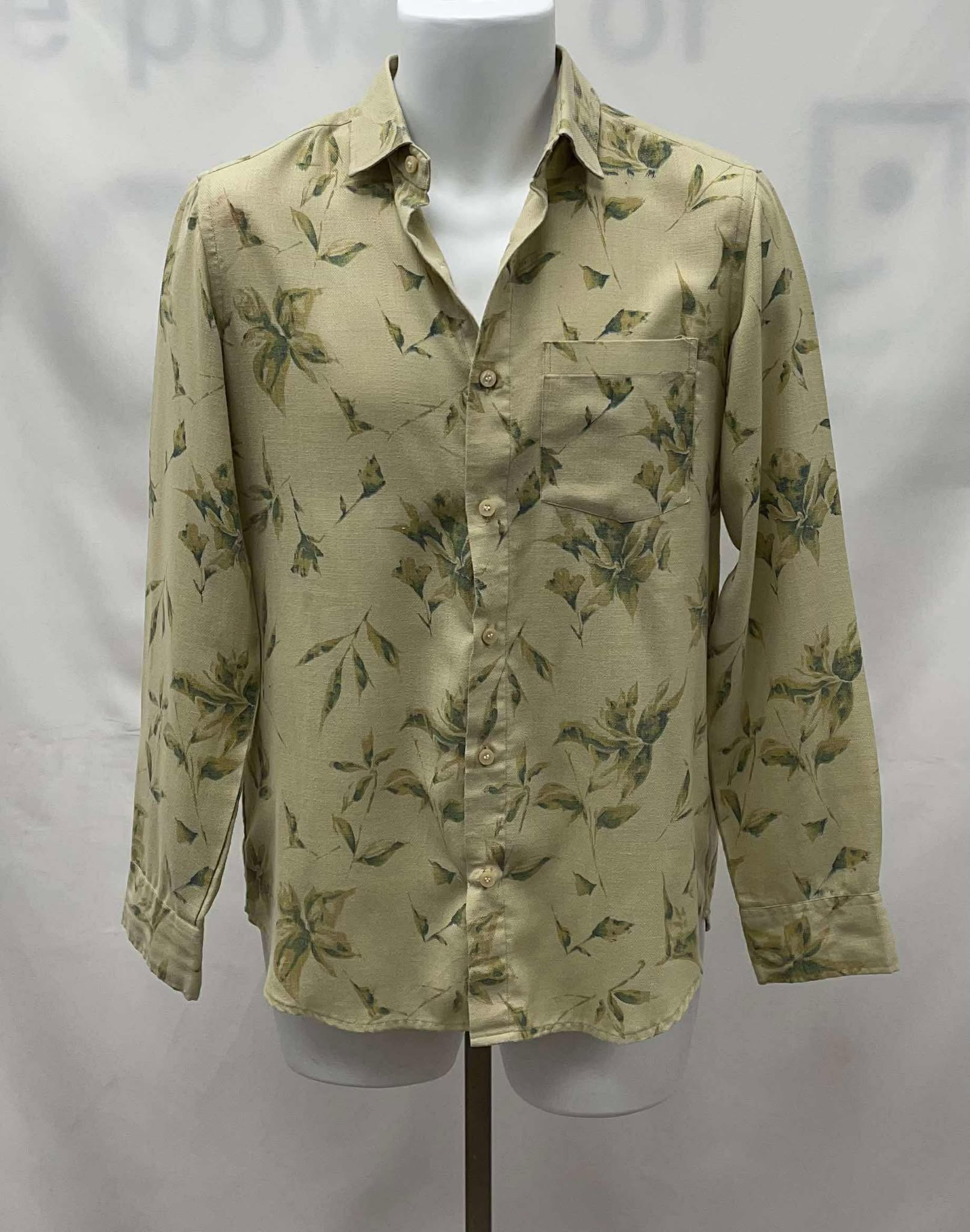 Details: Men’s tan with green floral print, collared, long sleeve, Vazir shirt.