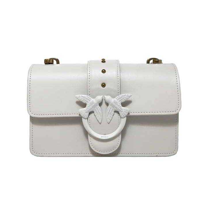 The Pinko Mini Love Bag Icon Simply in White is a chic and elegant handbag. Crafted from high-quality leather, it features the iconic Love Birds buckle in a matching metal finish. The bag is designed with a minimalist aesthetic, offering a microfiber-lined interior, a central zippered compartment, and additional pockets for organization. The shoulder strap combines a delicate chain with a leather insert for comfort and versatility, allowing you to wear it either over the shoulder or as a crossbody. This stylish accessory is perfect for adding a touch of sophistication to any outfit.