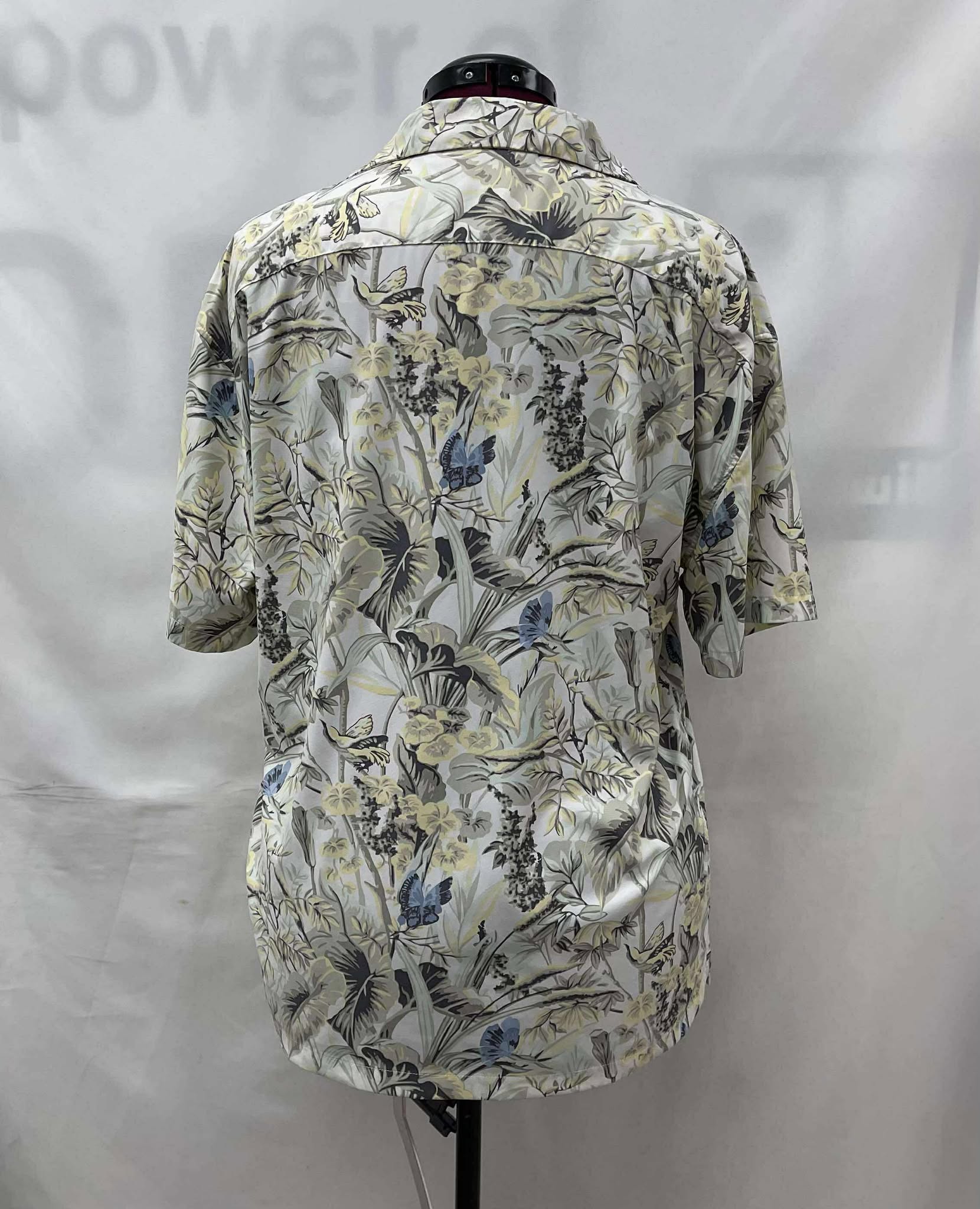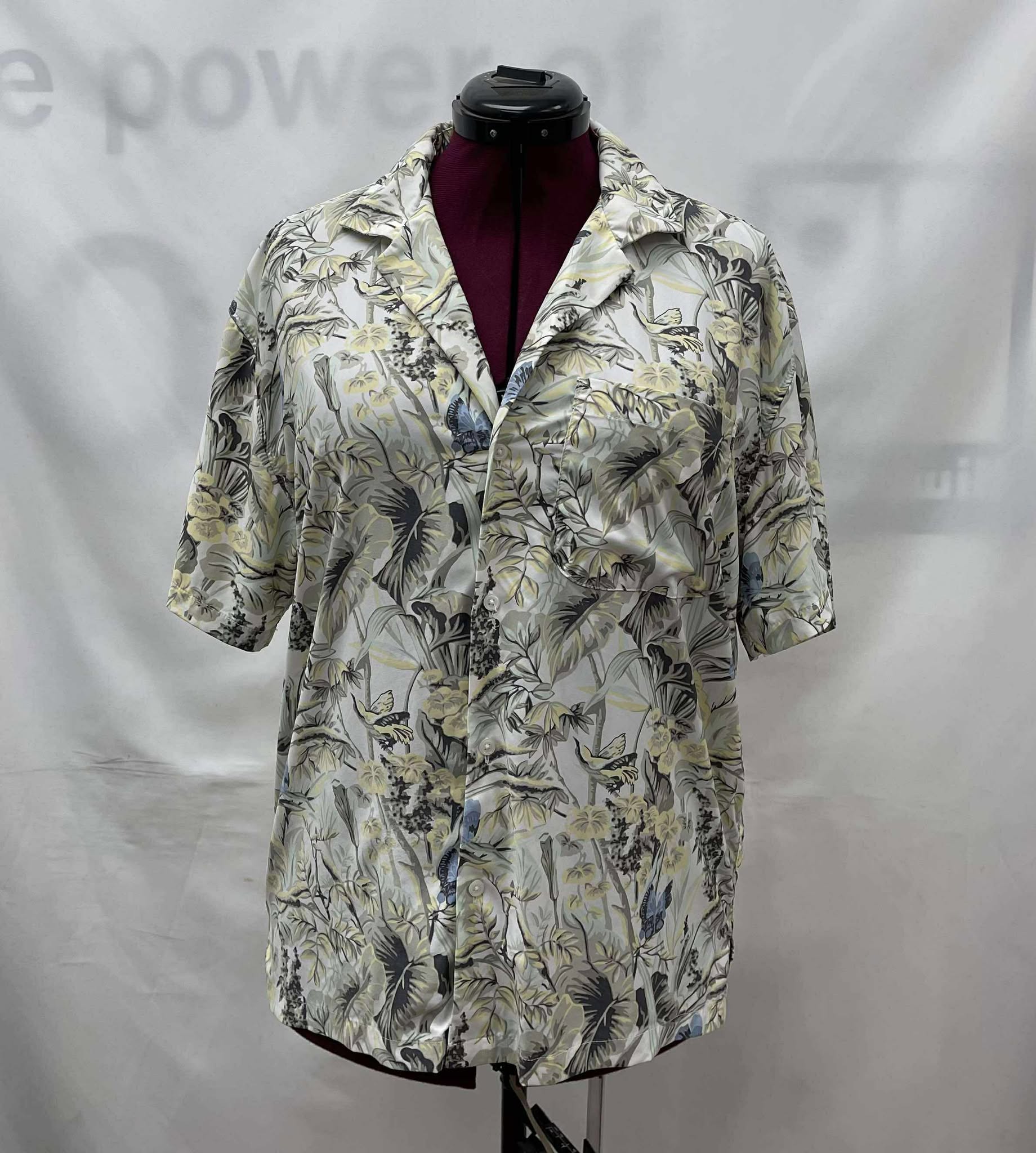 Details: Women’s off white with pale green and blue floral print, collared, short sleeve Abercrombie & Fitch top.