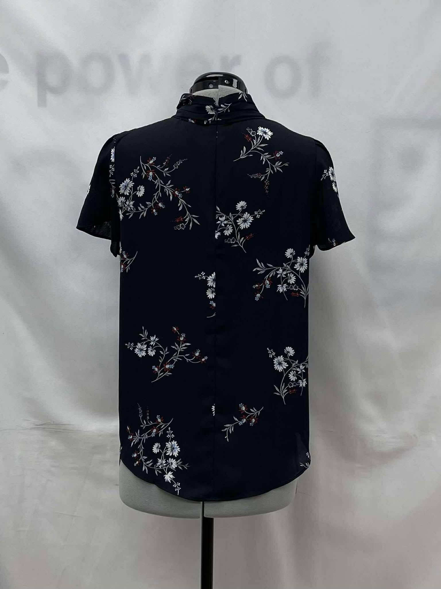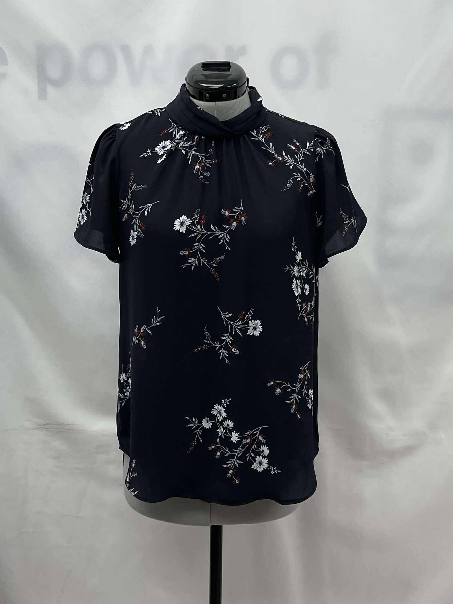 Details: Women’s navy blue with light blue, white and red floral pattern Ann Taylor short sleeve top.?