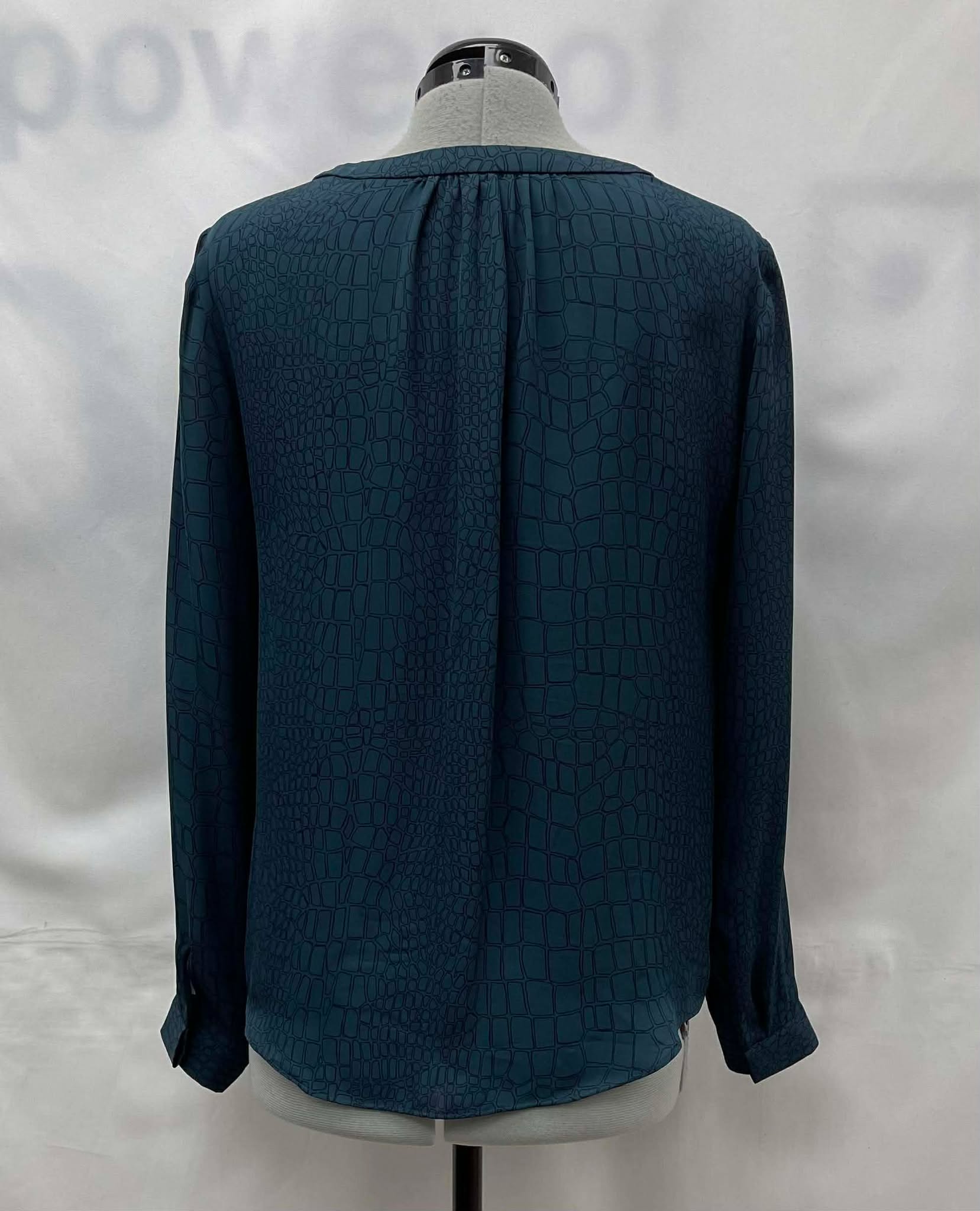Details: Women’s 100% silk, dark pine green, crocodile pattern, long sleeve Babaton blouse.?