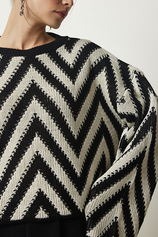 This women’s thick knit sweater with Spanish sleeves in a cream and black pattern keeps you warm in cold weather and offers comfortable wear thanks to its thick construction. Ideal for everyday wear, this sweater doesn’t compromise on comfort while adding a touch of style to your casual look. Its standard fit flatters various body types and can be easily paired with all kinds of outfits. Its straight cut offers a simple and timeless look, while the cropped silhouette allows you to create a modern and contemporary style. It provides a comfortable fit that hugs the body with its regular fit but isn’t tight. Movement isn’t restricted; the Spanish sleeve design adds a stylish and practical detail. It allows your arms to move comfortably, making it suitable for a wide range of users across all age groups.