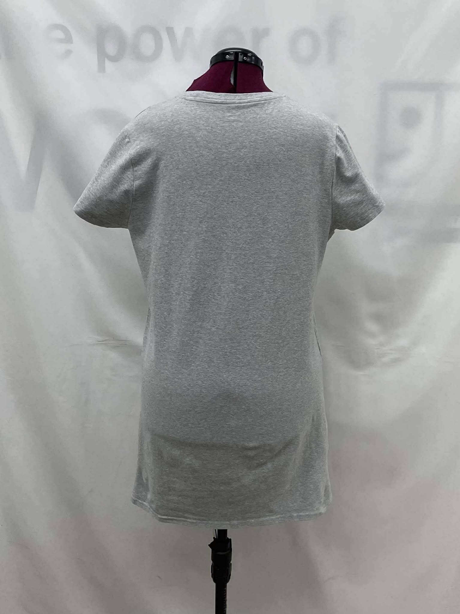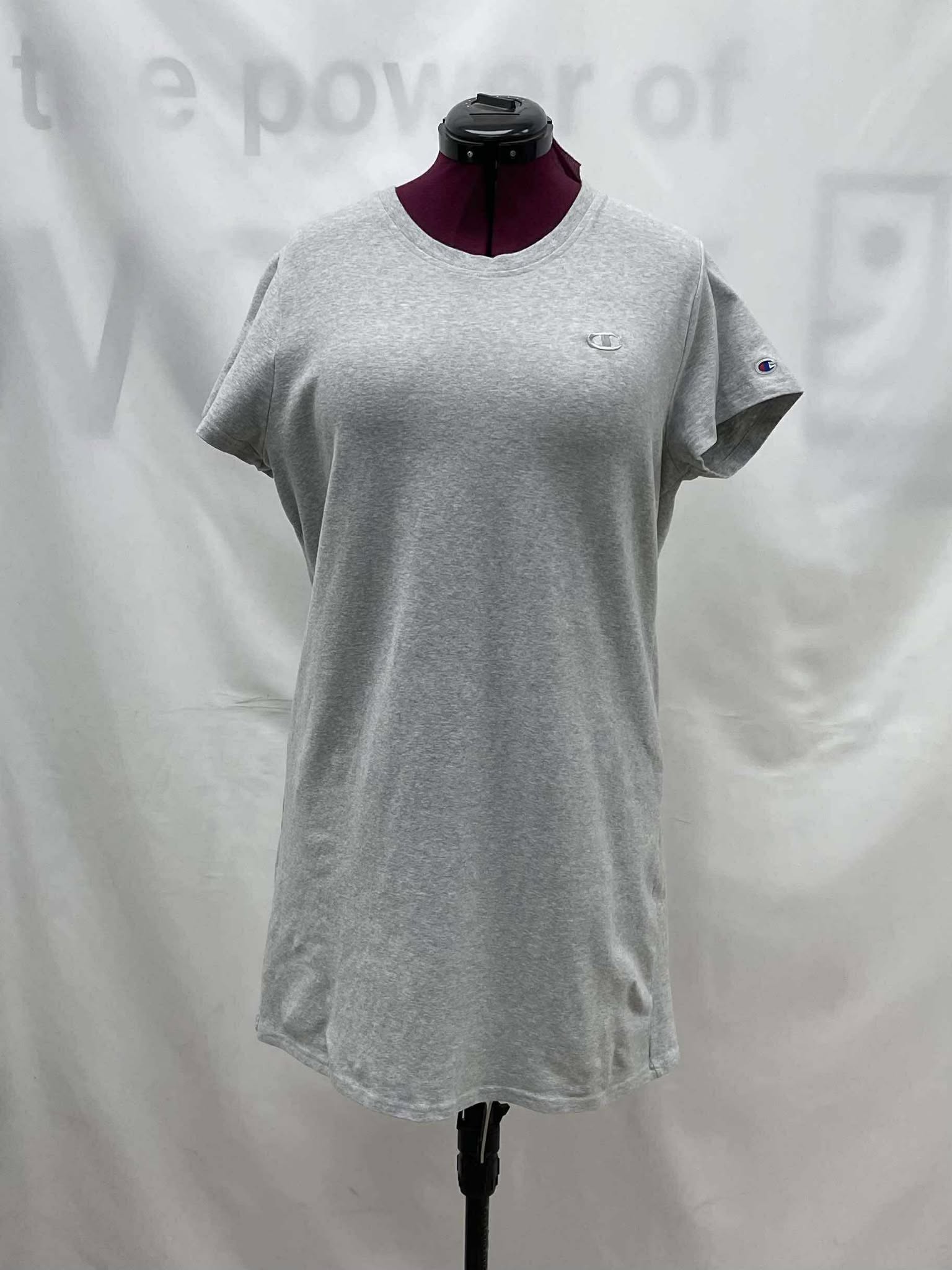 Details: Women’s light grey, long length, short sleeve Champion top.?