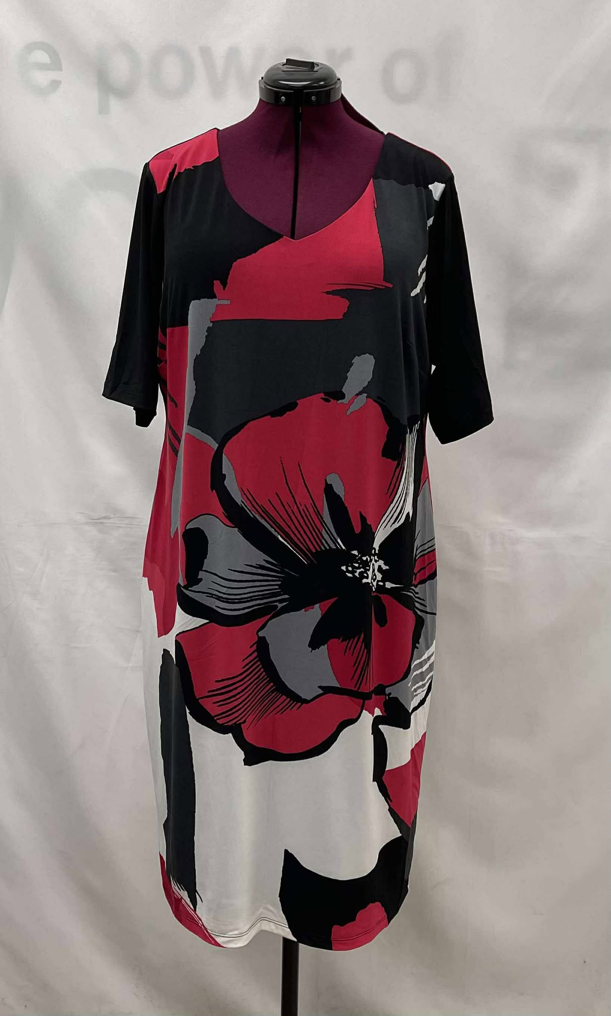 Details: Women’s black, white, and grey floral print, short sleeve Cleo dress.