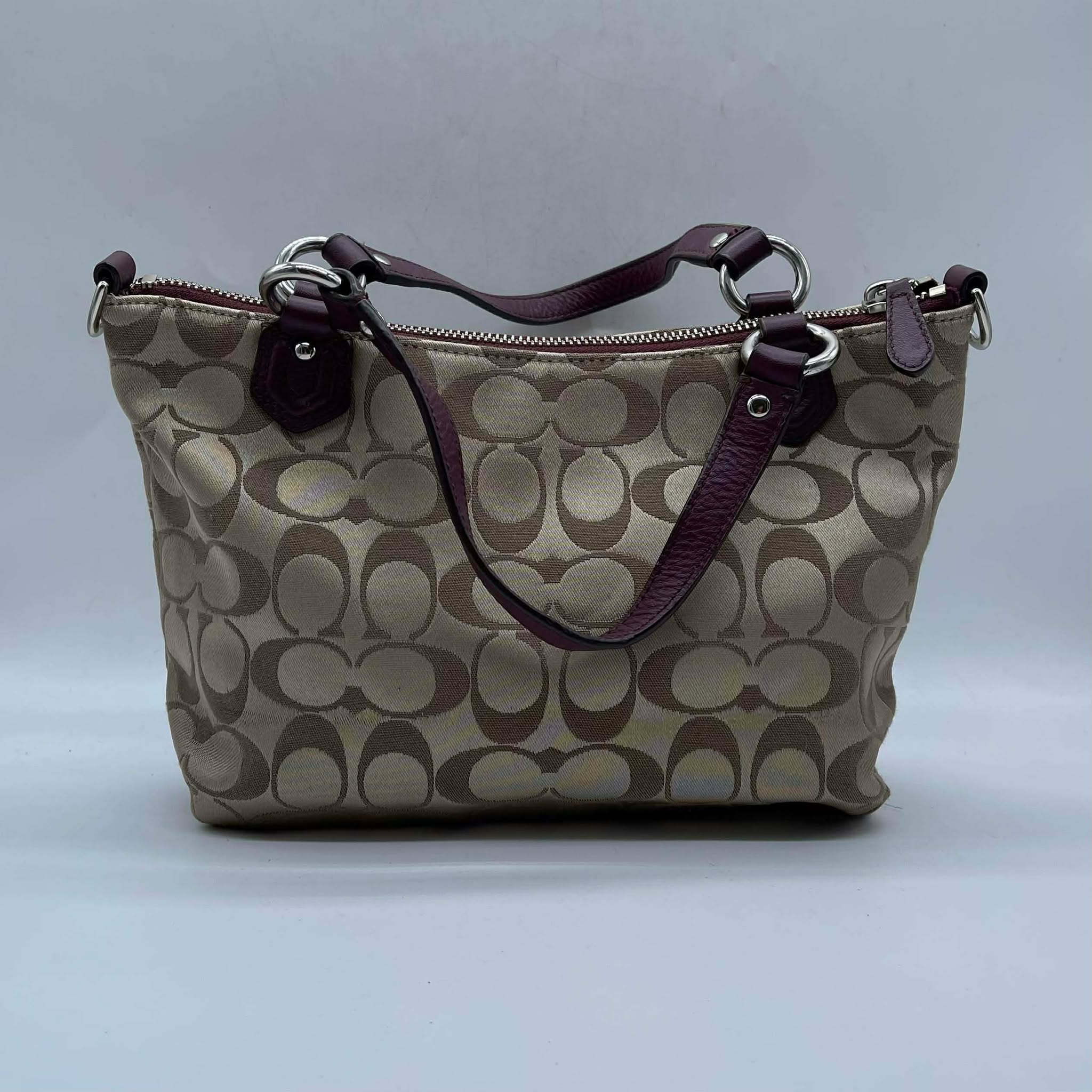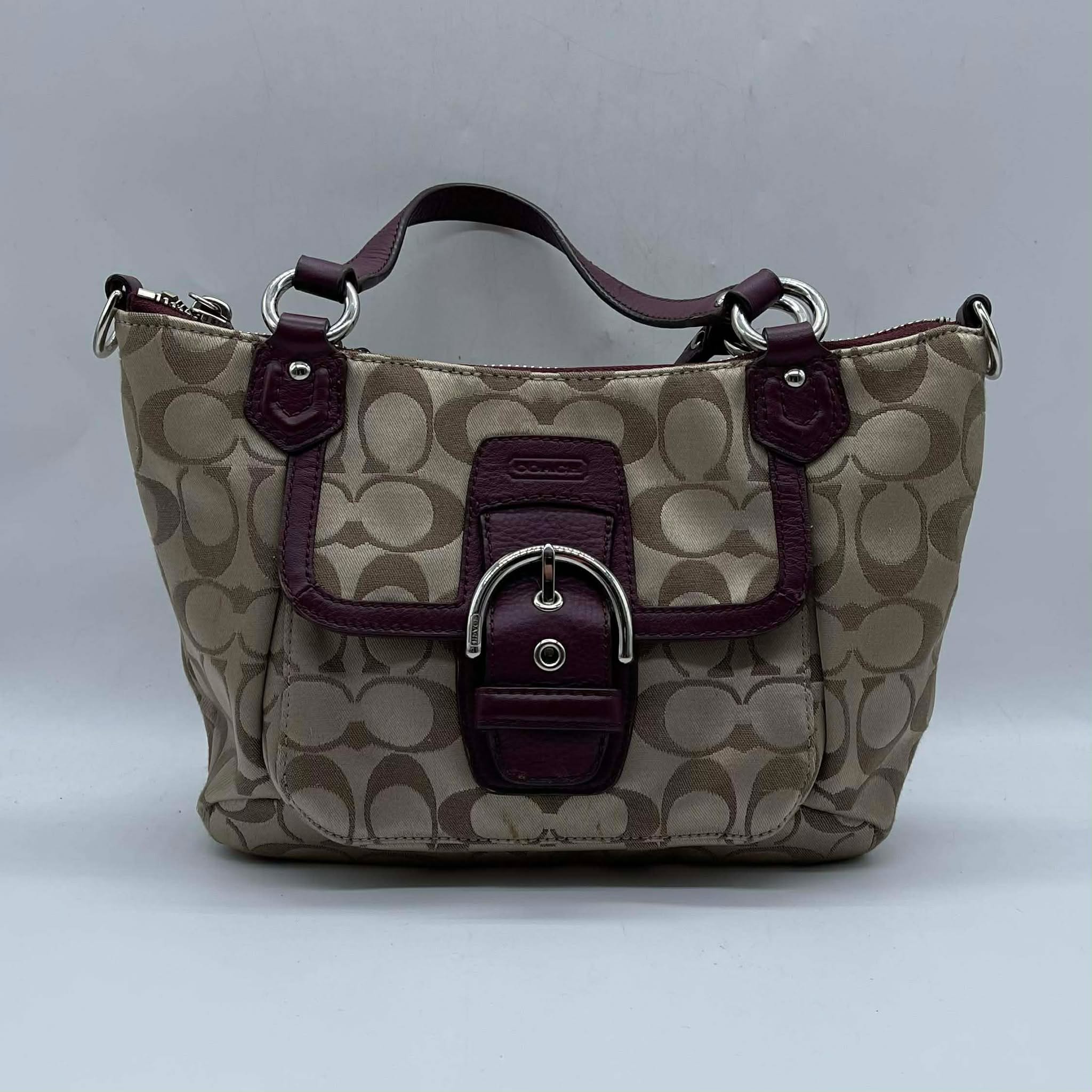 Details: Women’s beige pattern with burgundy trim, small Coach purse. ( As Is / Not Authenticated )