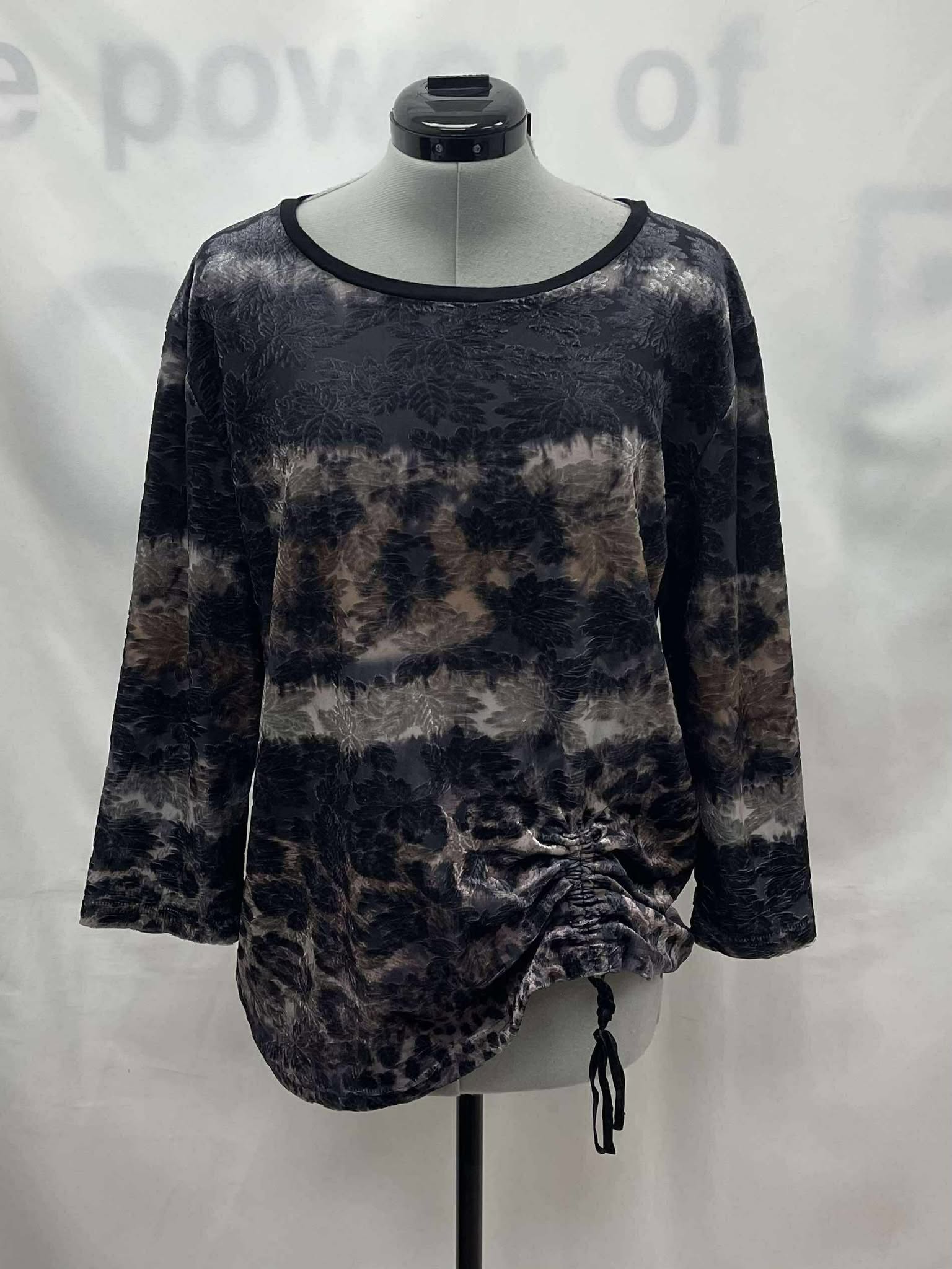 Details: Women black beige and tan patterned, long sleeve Compliments top.