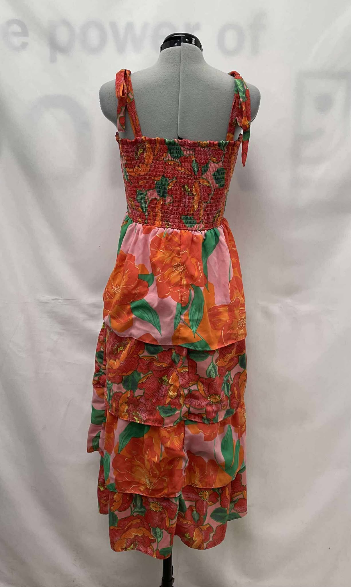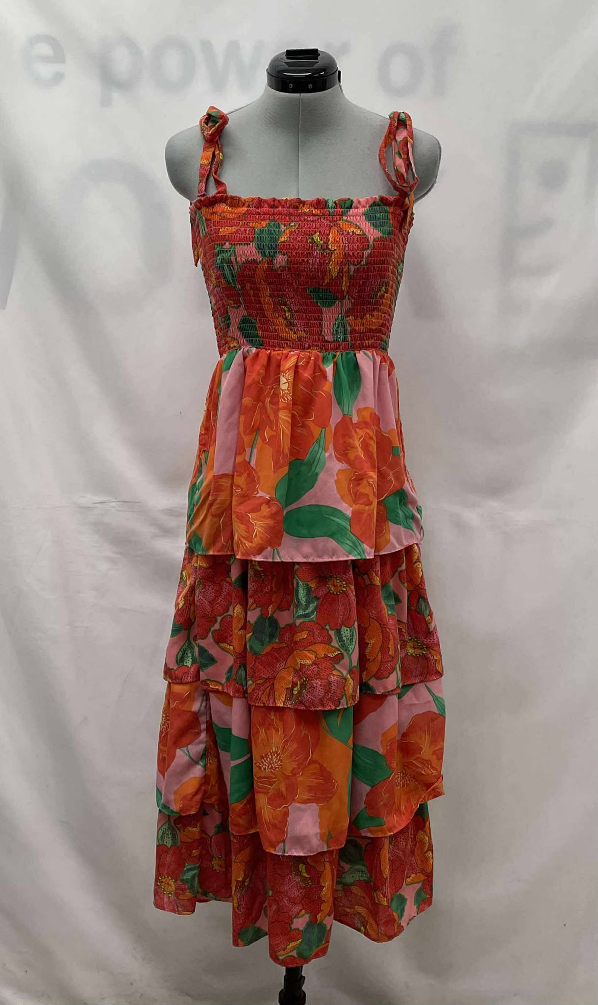 Details: Women’s orange, pink, red, and green floral print, sleeveless Crystal Doll dress.