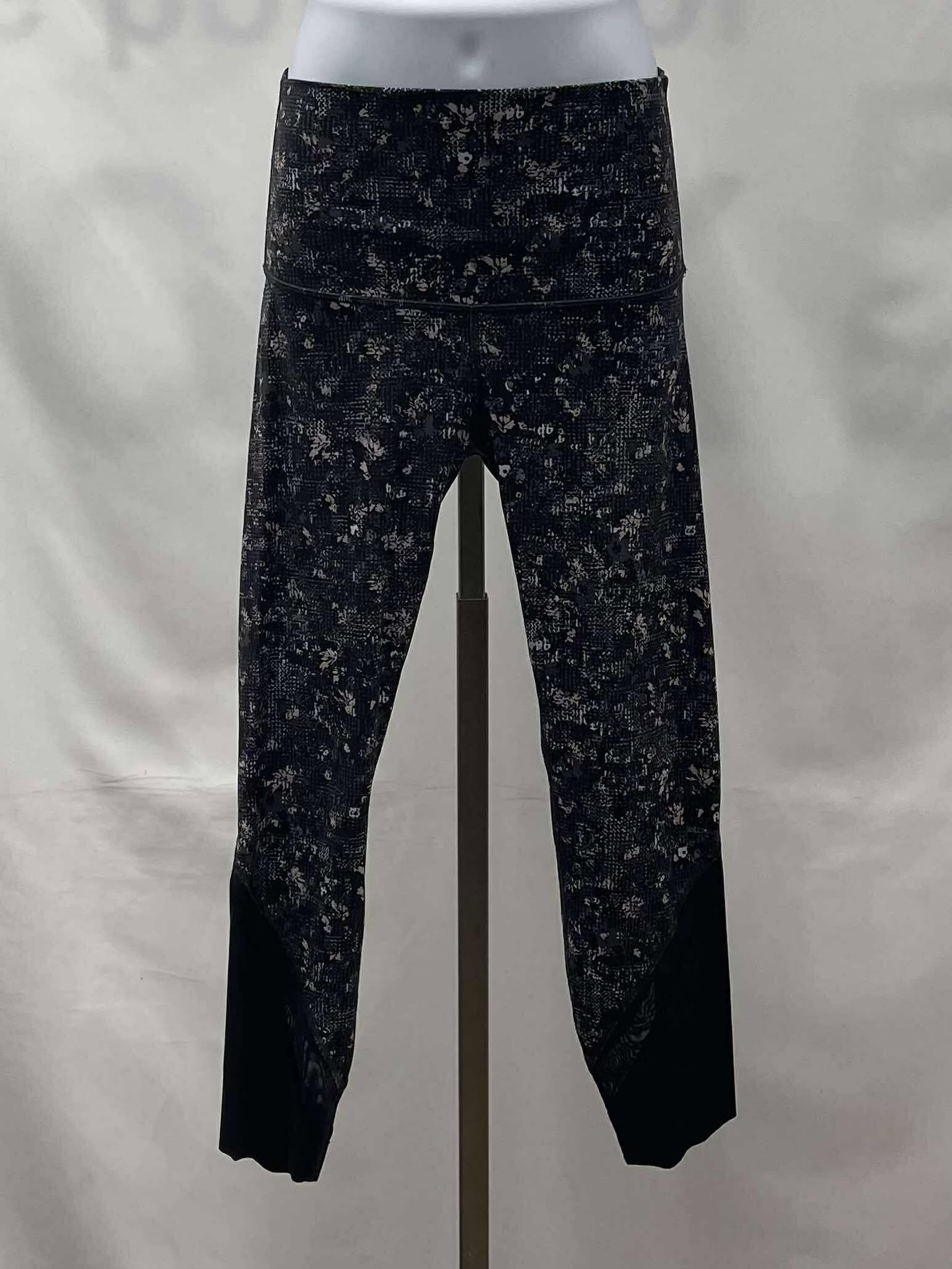 Details: Women’s black, grey and pale pink patterned with black panels Lululemon leggings.