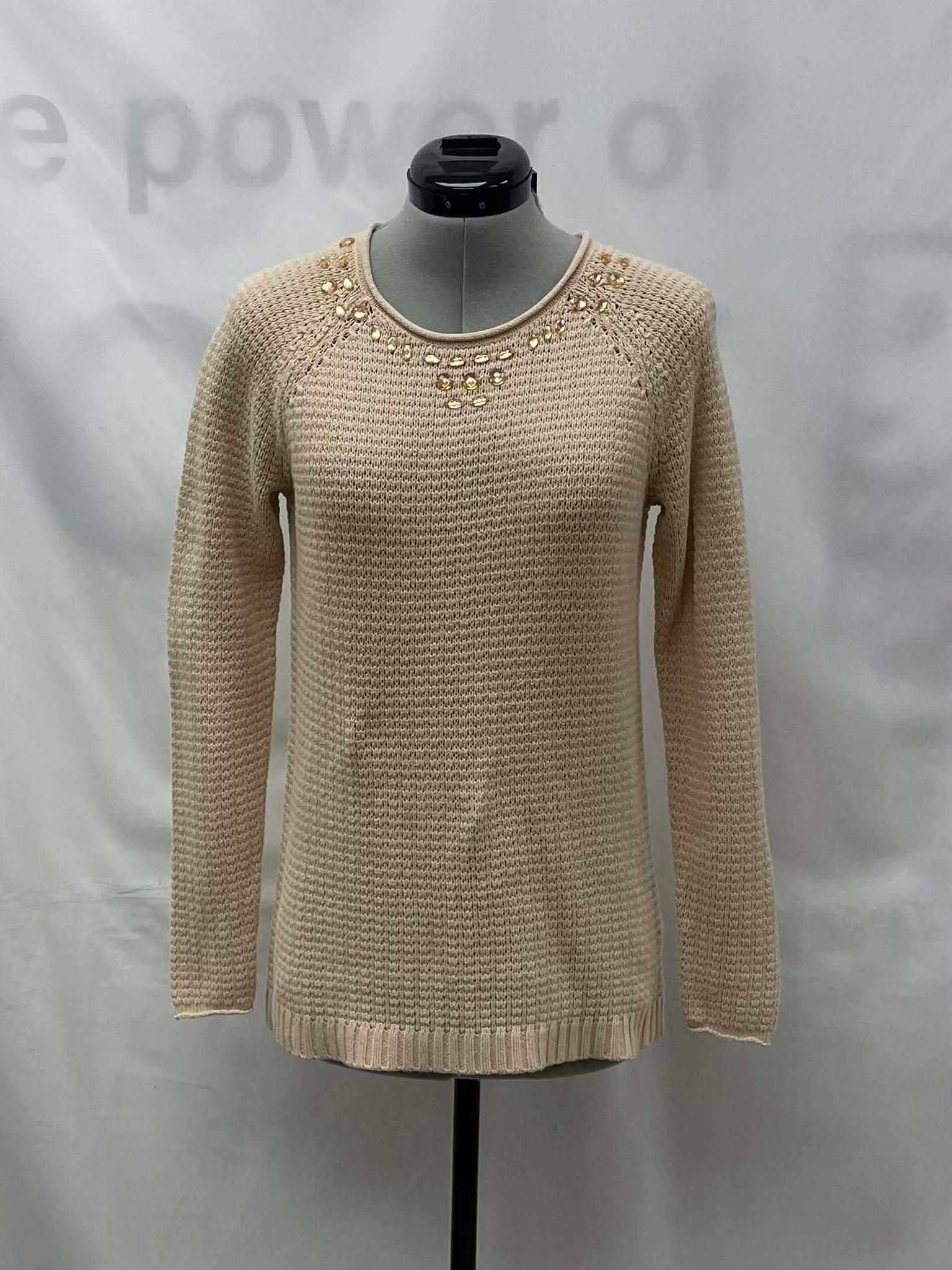 Details: Women’s light tan with faux jeweled collar, long sleeve Melanie Lyne sweater.