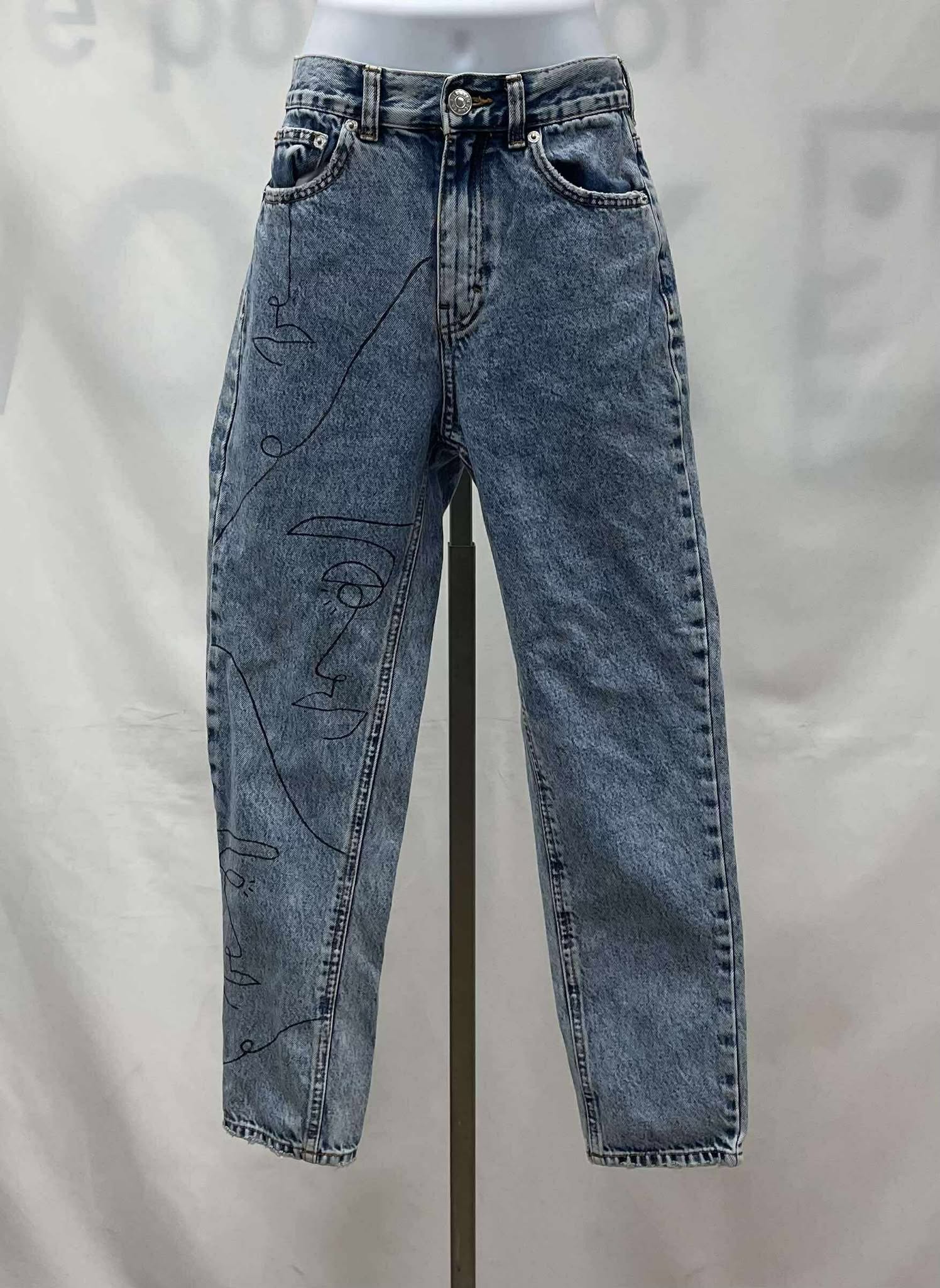 Details: Women’s light blue faded denim, with graphic print on right leg, Pull & Bear jeans.