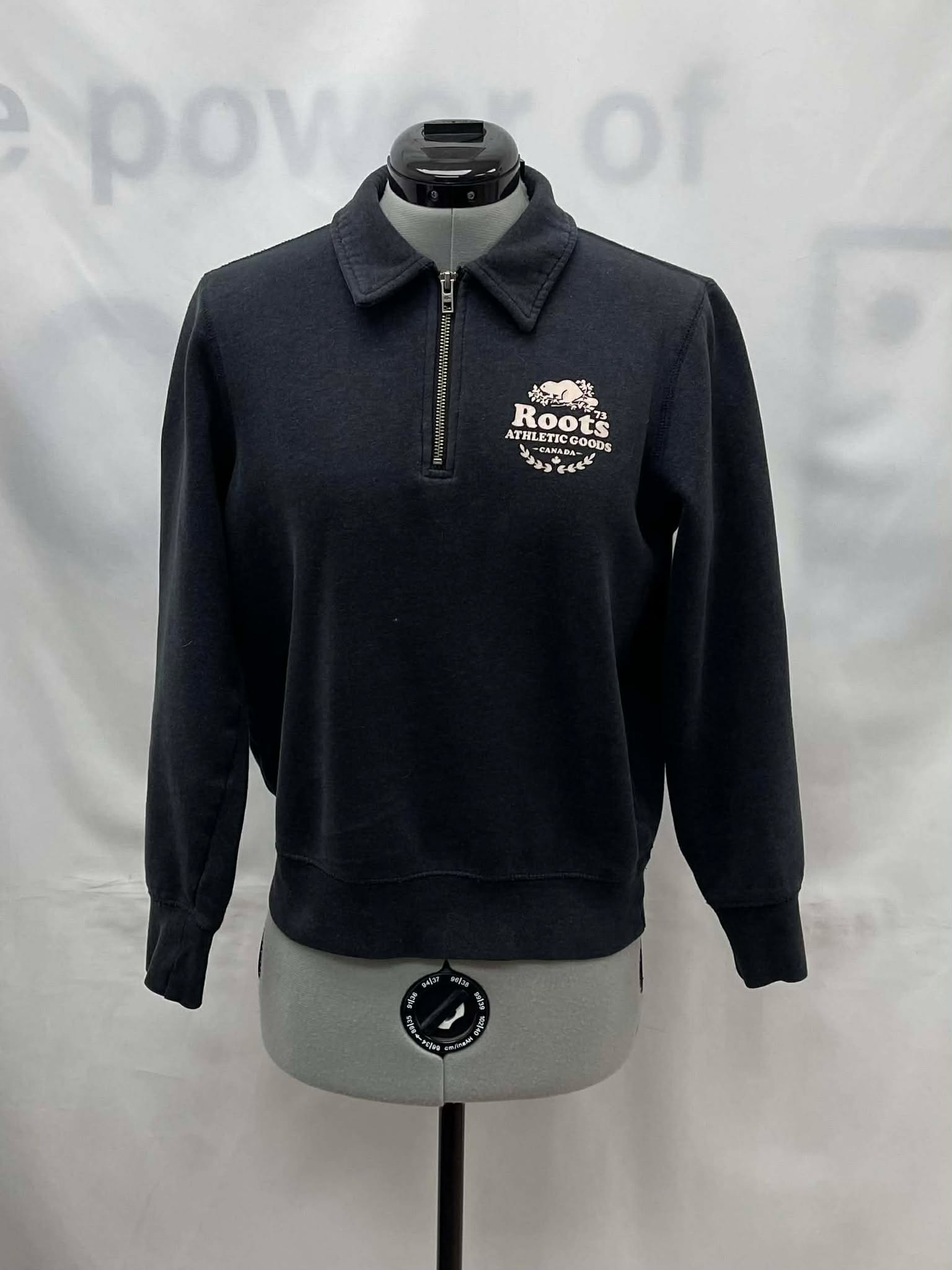Details: Women’s cobalt grey long sleeve Roots sweater.?
