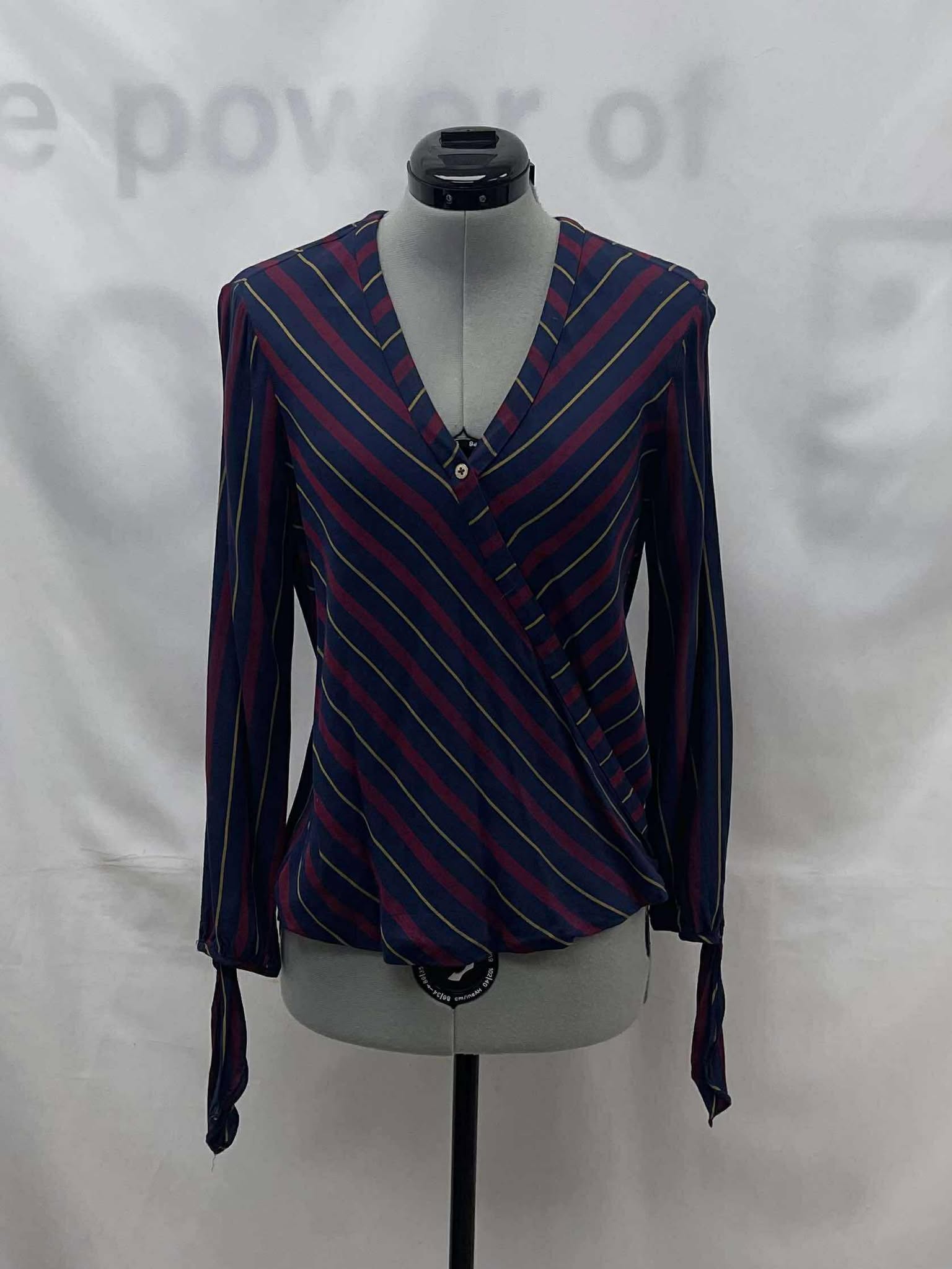 Details: Women’s navy blue, dark red and yellow stripped RW&CO long sleeve top.?