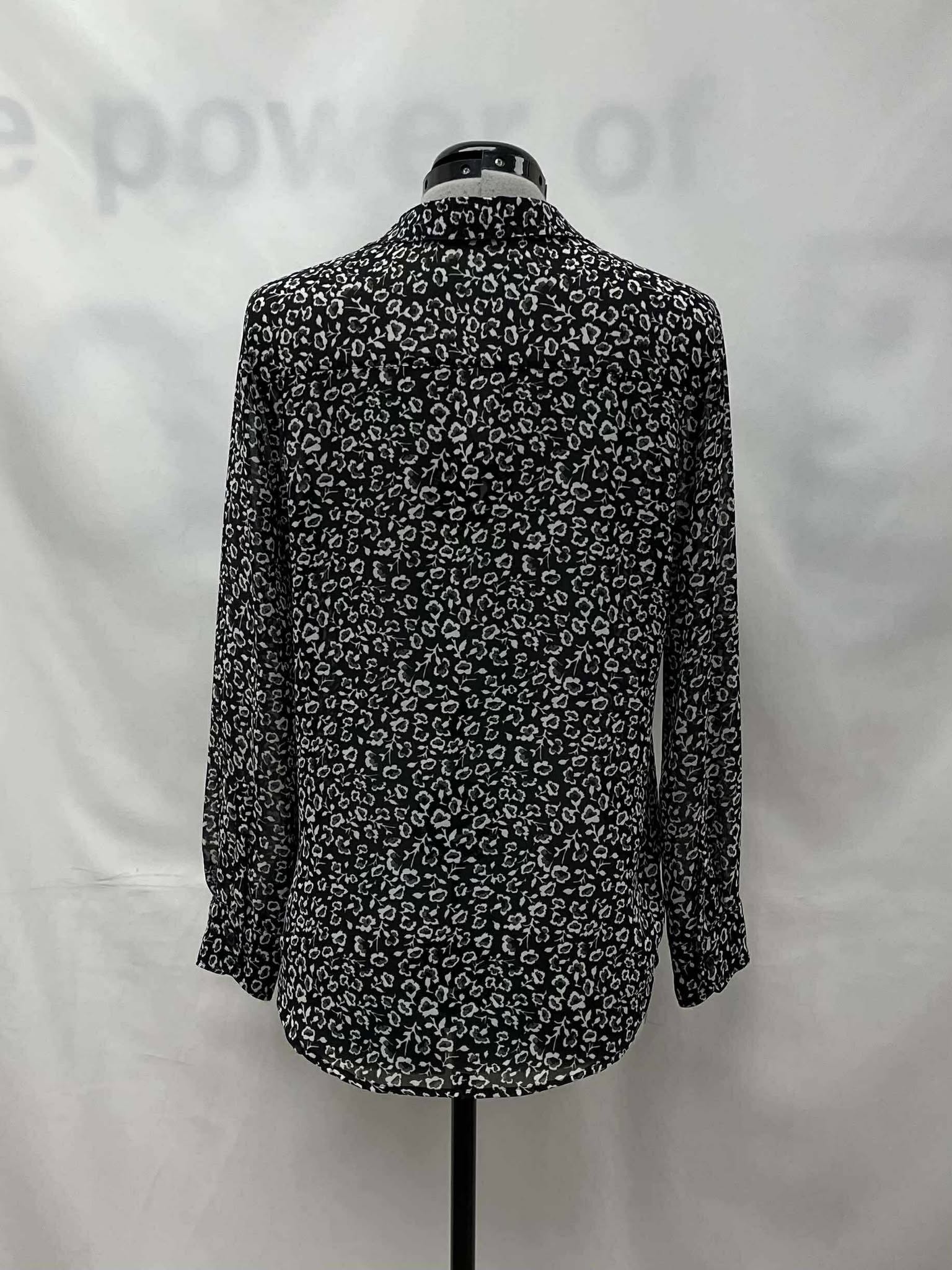 Details: Women’s black with white floral print, collared, long sleeve Sunday Best blouse.