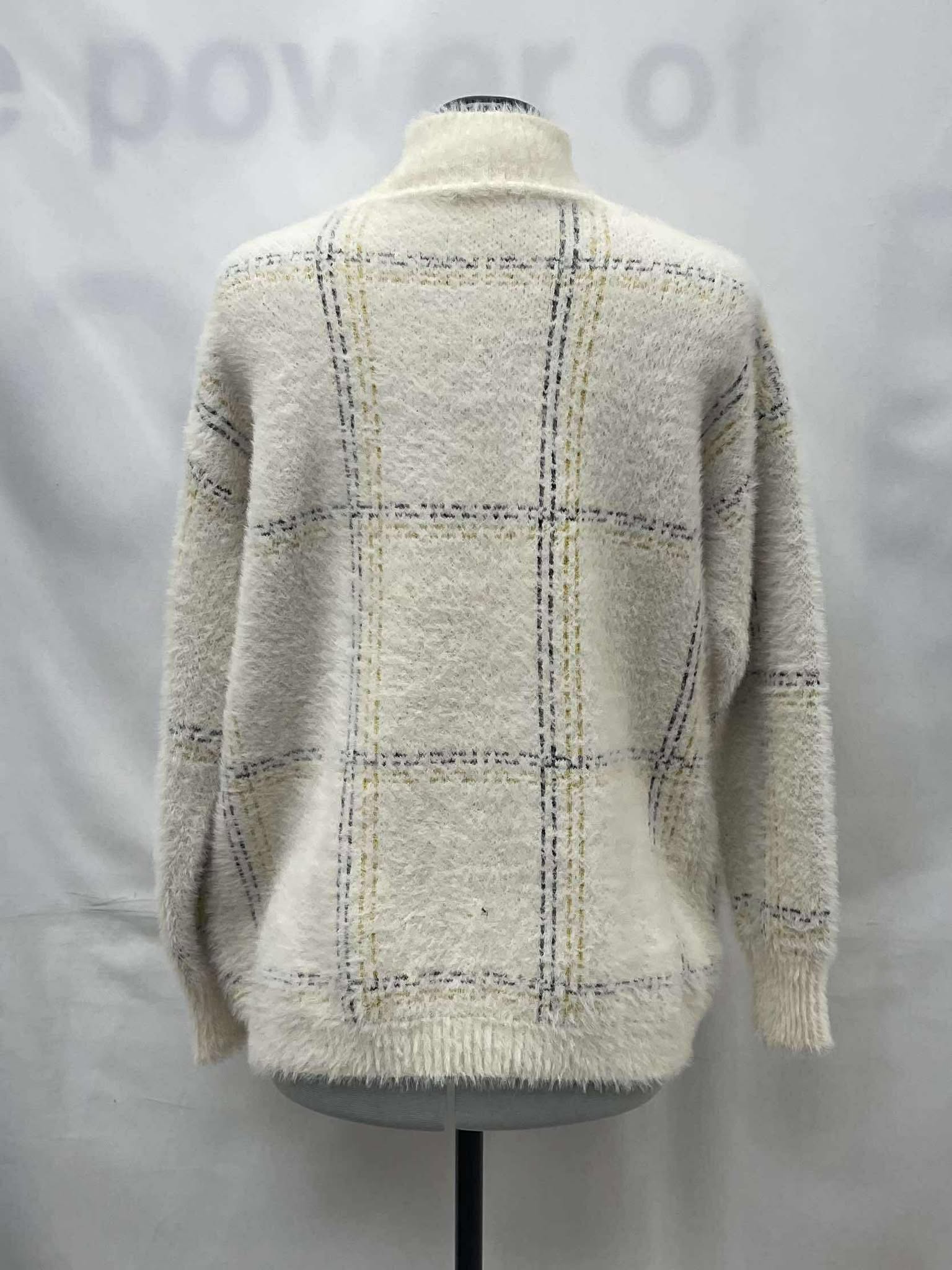 Details: Women’s?fuzzy off white with beige and black plaid pattern, long sleeve Suzy Shier sweater.