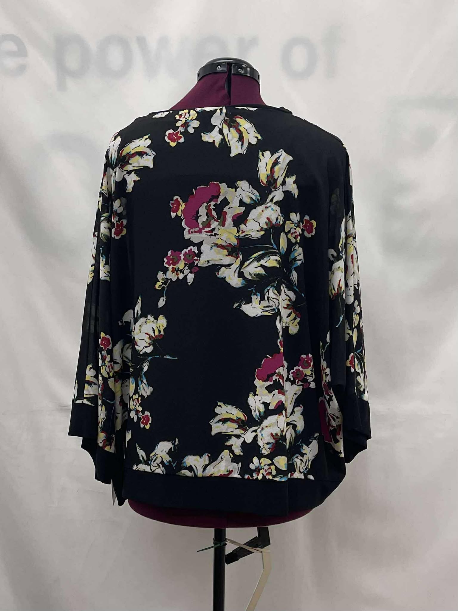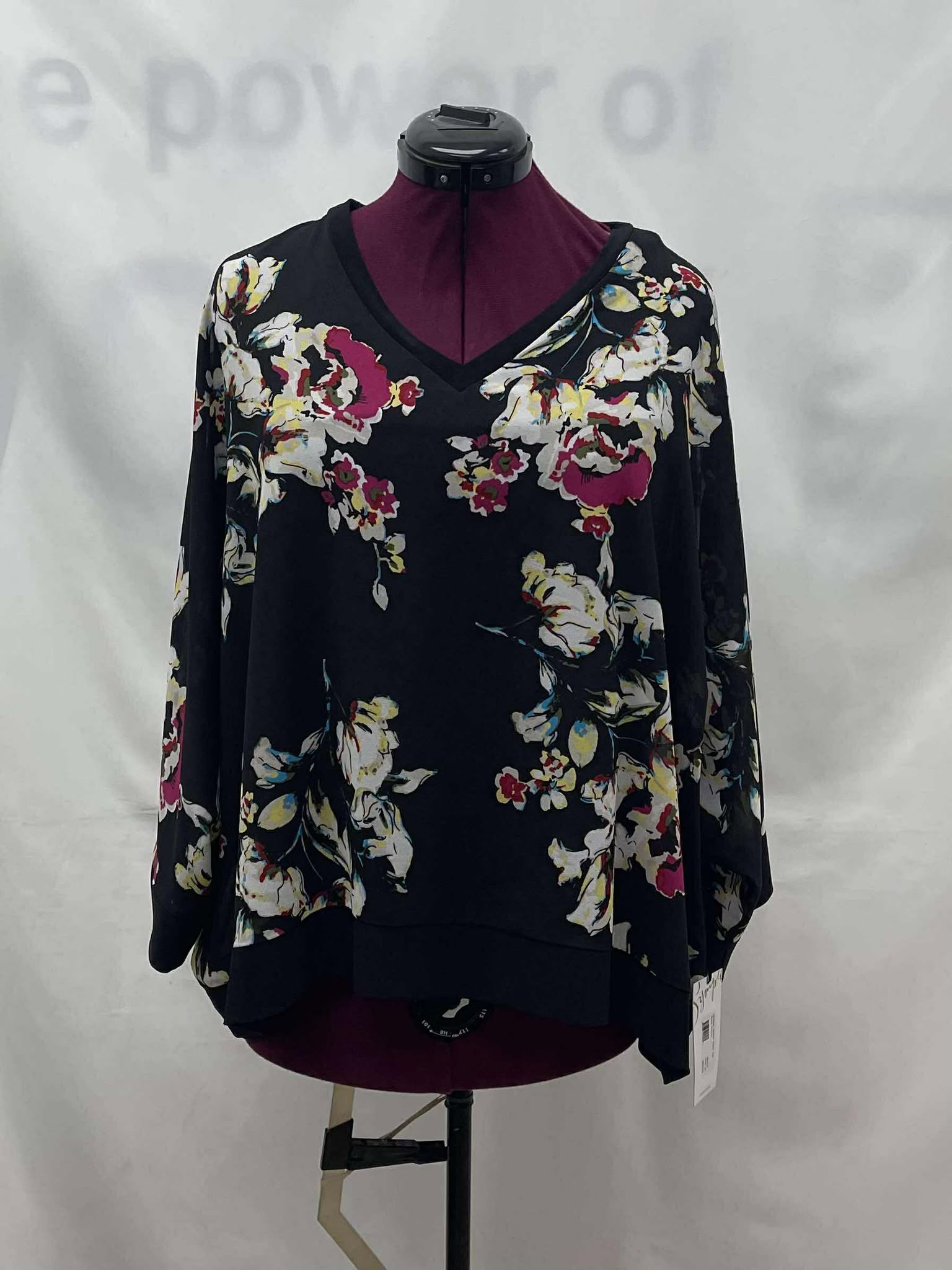 Details: Women’s black with pink, white, yellow, red and blue floral pattern Sympli short sleeve top. Original tags still attached.?