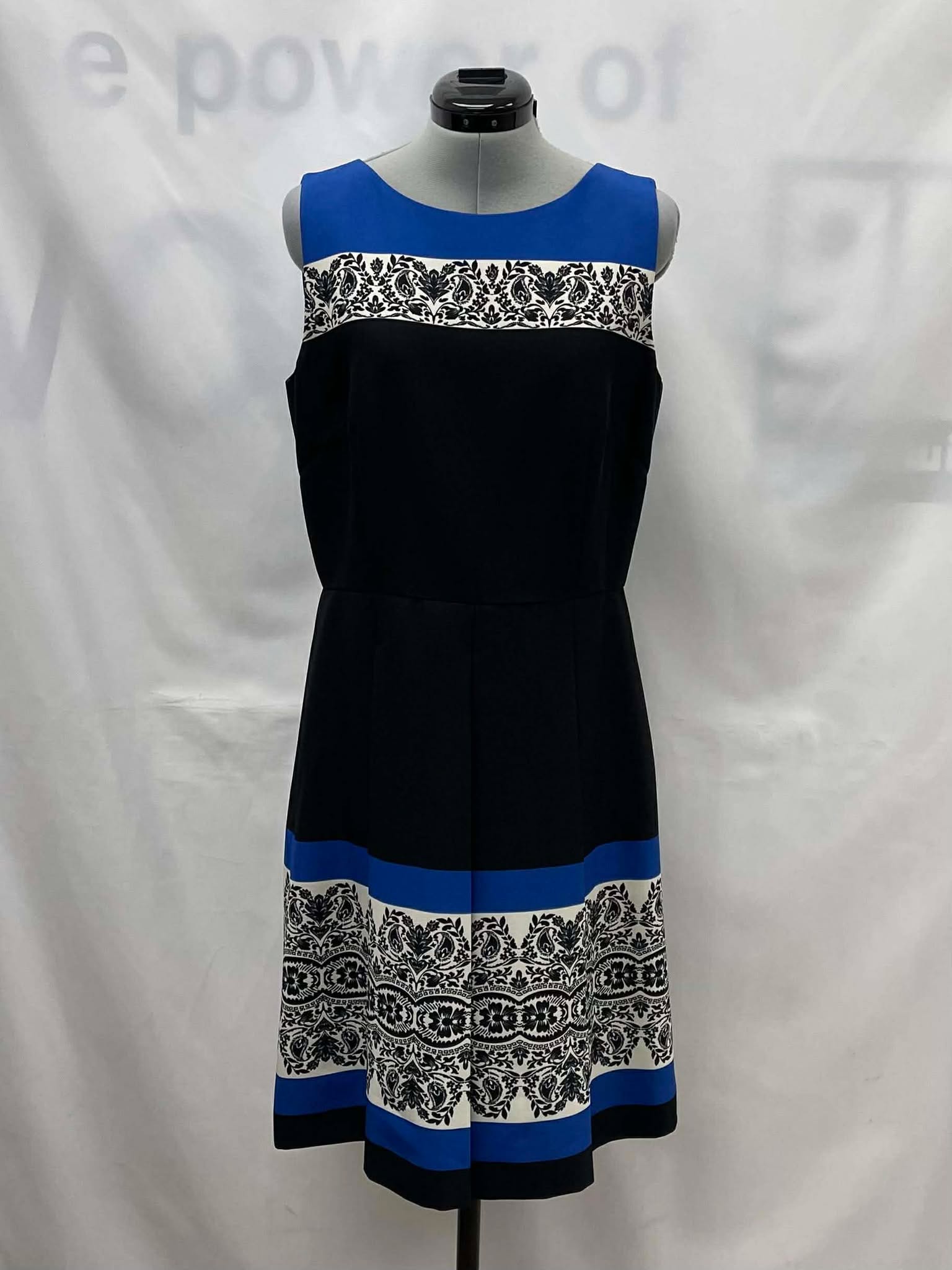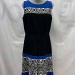 Details: Women’s black with blue banding and floral print, sleeveless Tahari dress.